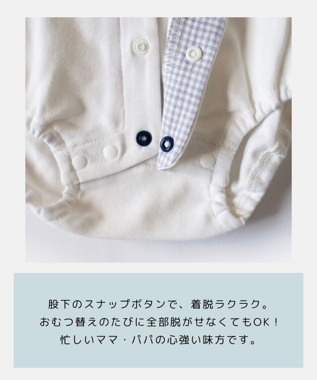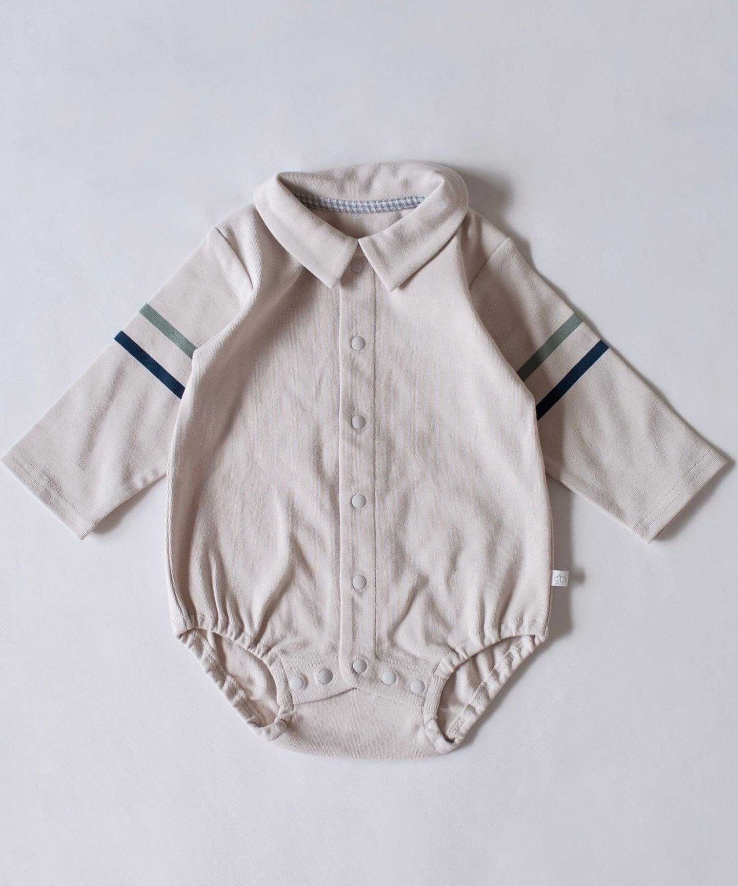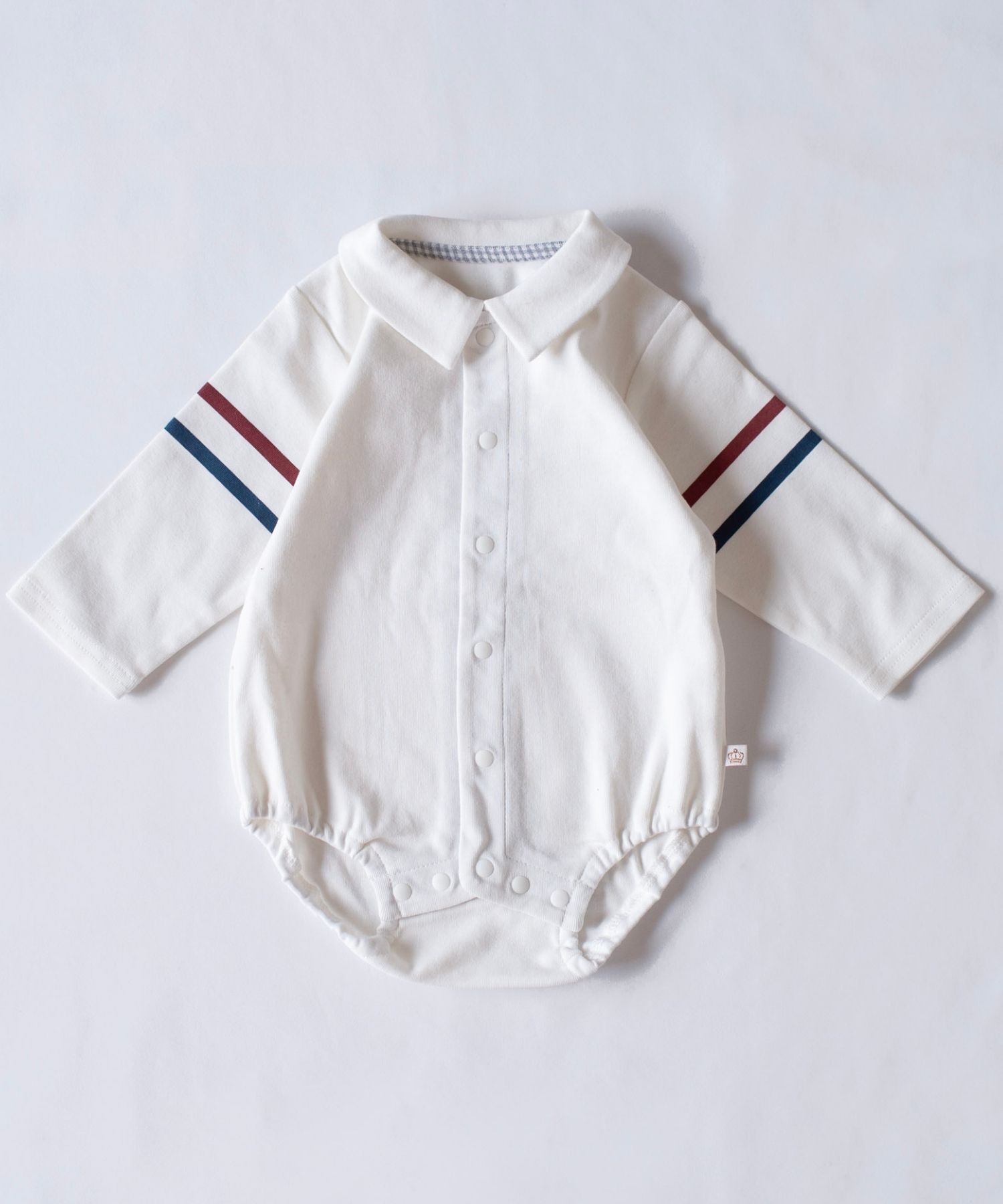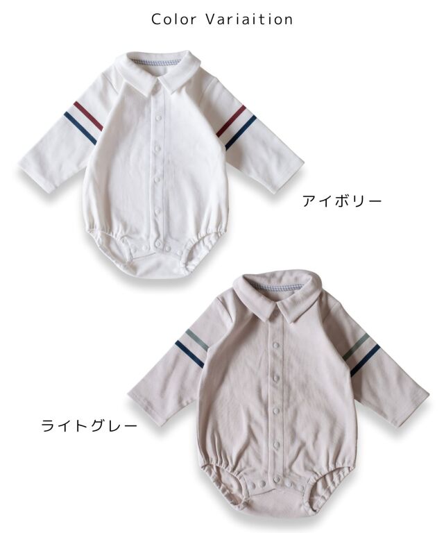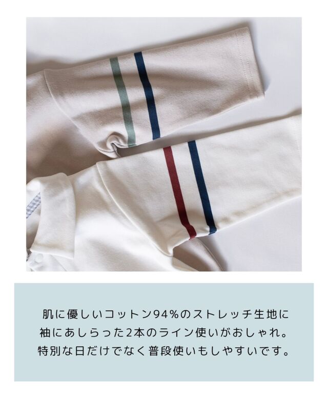 きちんと感のある衿付きベビーウェアは特別な日のおめかしにも、普段使いにもおすすめです。スナップボタンで裾まで全開するのでお着替えラクラク。袖にあしらったラインのデザインがアクセントになっています。コットン94%のストレッチ生地で赤ちゃんの肌に優しい生地です。