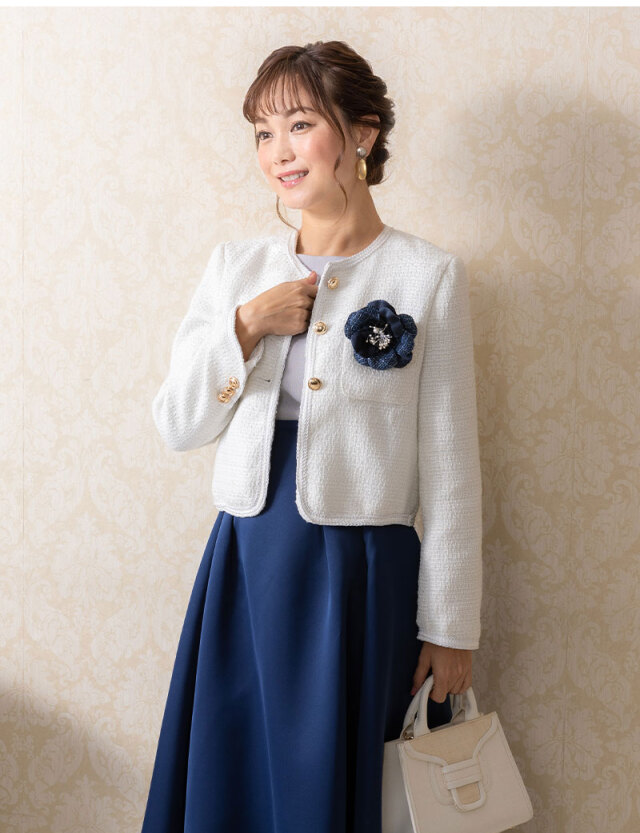 胸元に添えるだけでパッとコーディネートを華やかに彩る、上品ツイード&艶めくサテン使いが美しいコサージュはスウィートマミーの授乳服&マタニティフォーマルにぴったり!