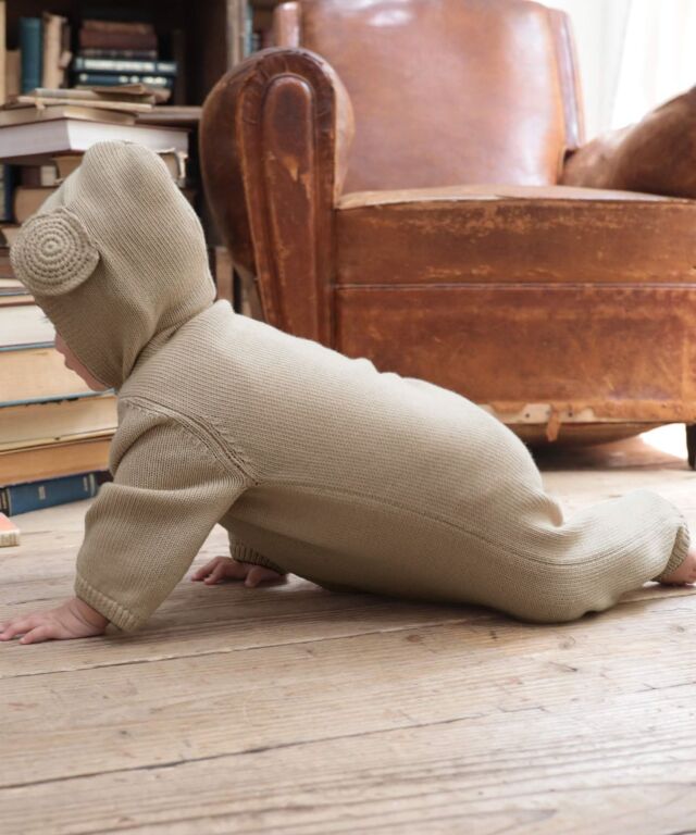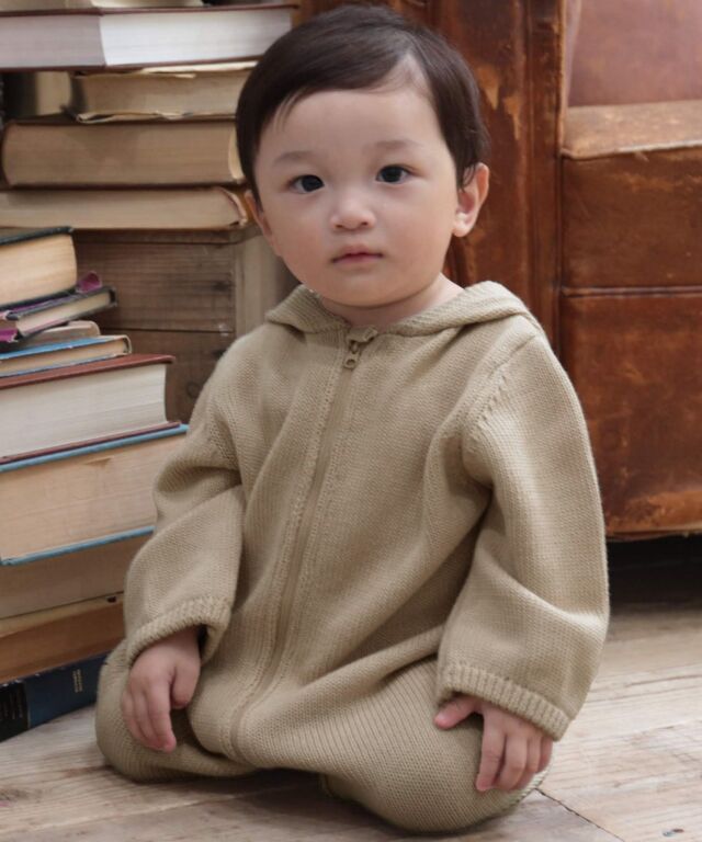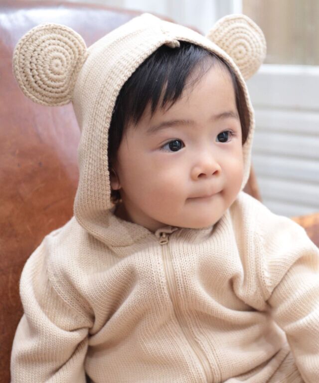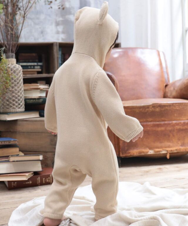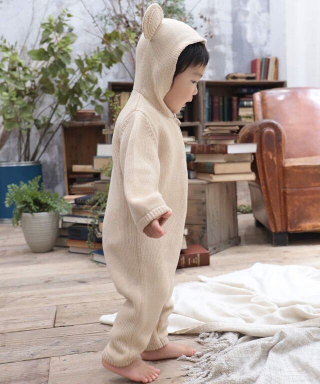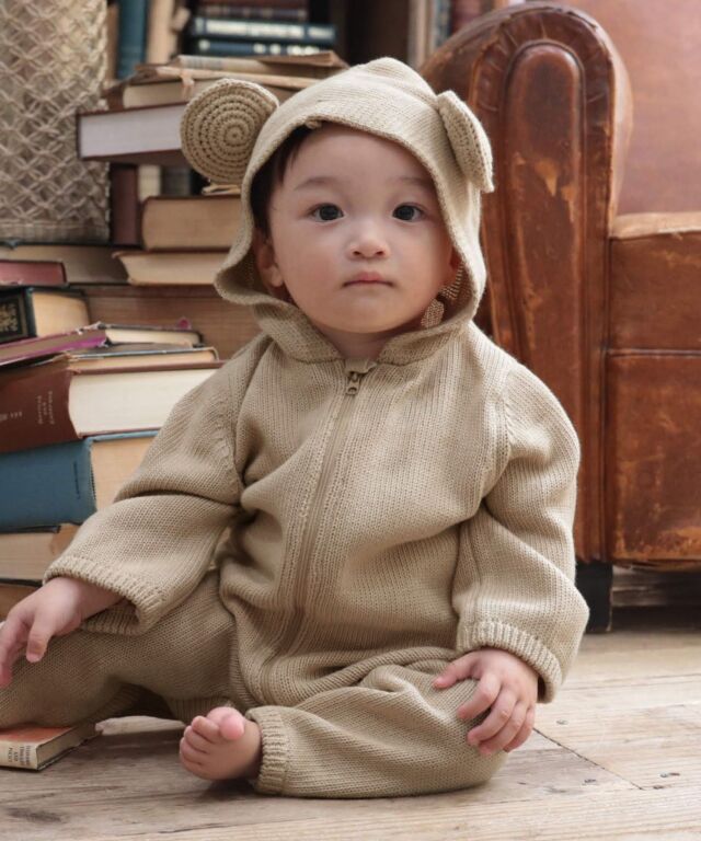 着せた瞬間から、ママもパパもメロメロになっちゃう、まるでくまの編みぐるみみたいなカバーオールです。