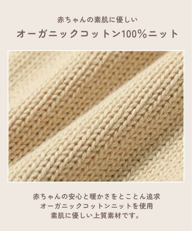 オーガニックコットン100%ニットを使用しているので、赤ちゃんの素肌に直接触れても安心安全です。