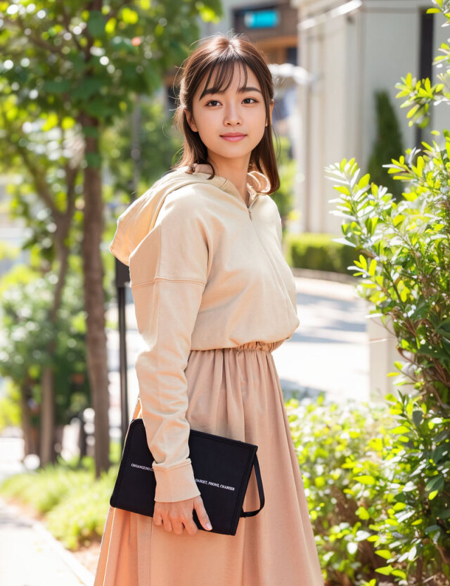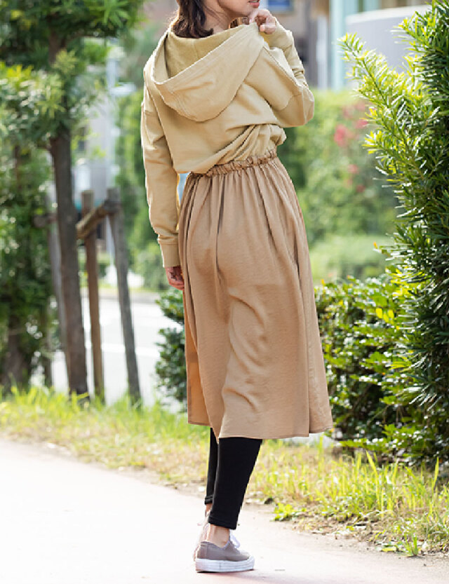 ミディ丈で低身長の方も着やすく、足さばきも抜群。両脇にはポケットが付いているので、ちょっとした小物入れにも便利です。