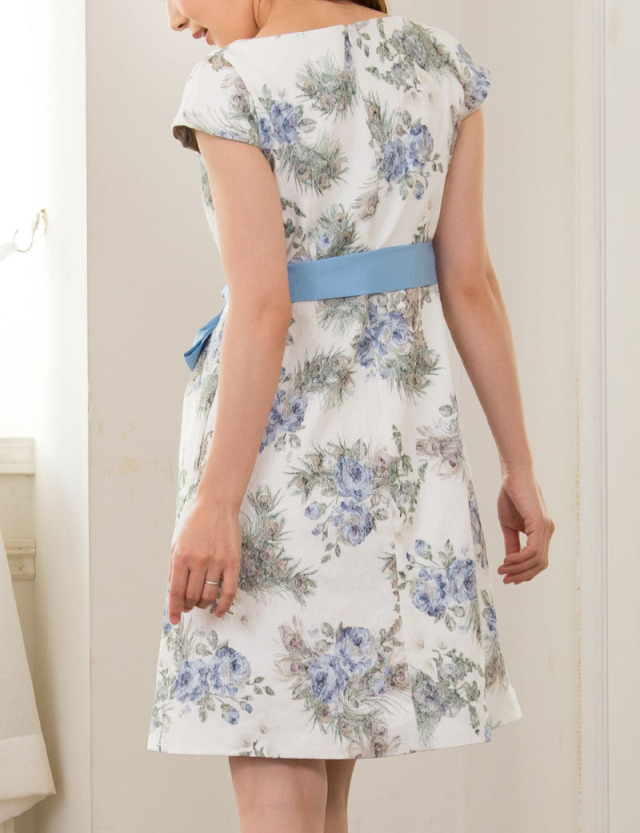 花柄が織り込まれたストレッチジャガードに、孔雀の羽やブーケ柄の印象的なプリントが美しいワンピースです。