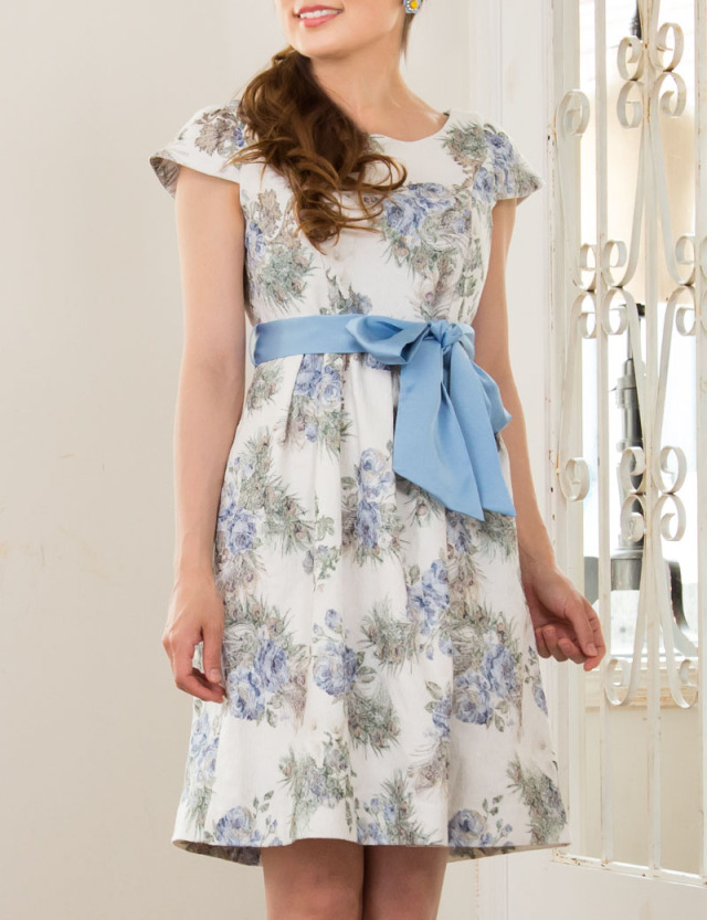 大きめの艶やかなサテンリボンをウエストマークに、メリハリあるシルエットで、着やせ効果も抜群。