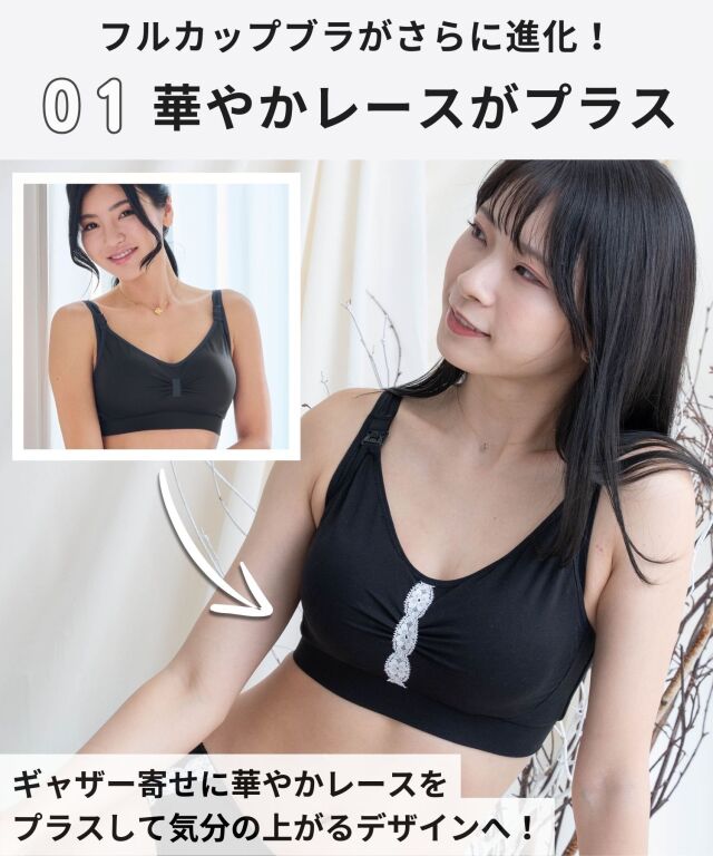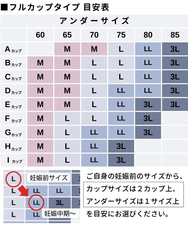 妊娠時は別メーカーのマタニティブラのMサイズを着用してましたが、アンダーに合わせると胸がギリギリカップに収まってませんでした。そして出産後は完全サイズアウトに。 こちらの商品はM・Gサイズもあり、Lサイズでもアンダーが65からとのことなのでLサイズを注文しました。 アンダーは1番短く締めても多少ゆとりがあるものの、胸の収まりは非常によかったです。 以前の下着だと母乳パッドも満足に付けられなかったのですが、フルカップブラだと全体が包まれるのでしっかりと貼り付けることが出来ました。 ただこのホックだと授乳中片手で留めづらいのが難点です。慣れれば問題ないのかもしれません。 かといってハーフカップだと授乳しやすい分、収まりきらない可能性があるので難しいなと思いました。 |