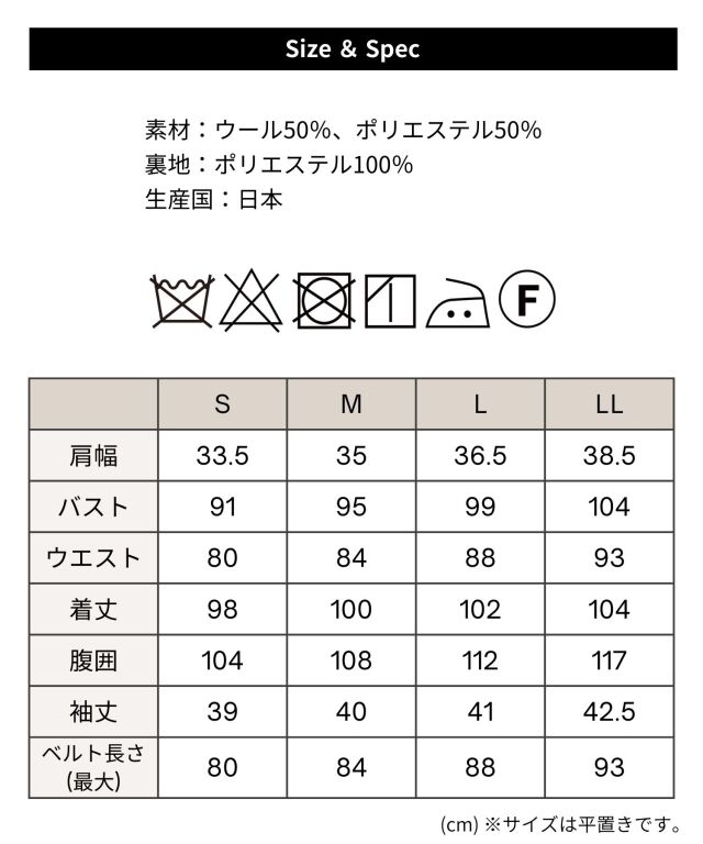 S M L LL 着丈 98 100 102 104 肩幅 33.5 35 36.5 38.5 バスト 91 95 99 104 ウエスト 80 84 88 93 腹囲 104 108 112 117 袖丈 39 40 41 42.5 ベルト長さ(最大) 80 84 88 93