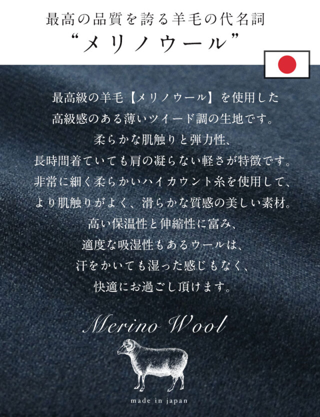 王道メリノウール素材で、その高級感と縫製のよさ、上品なシルエットは、一目見れば違いがわかる上質な仕上がりは日本製ならでは。