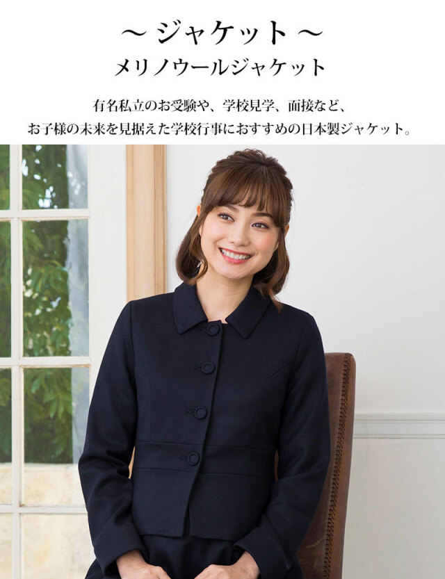最高級の羊毛【メリノウール】を使用した高級感のある日本製スーツセットです。有名私立のお受験や、学校見学、面接など、お子様の未来を見据えた学校行事に着まわせる、シンプルで好印象のワンピースと着回しの効くジャケットの2点セット。