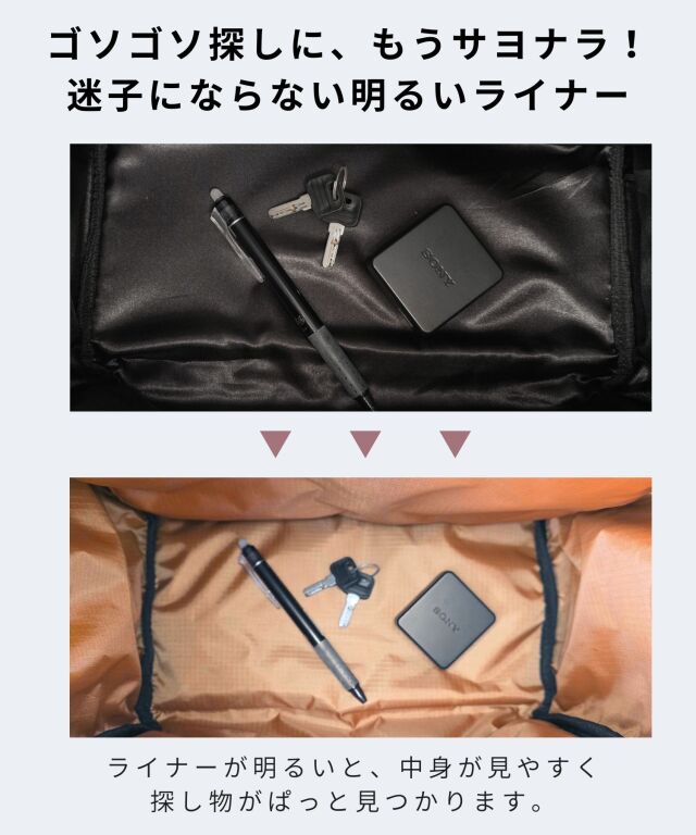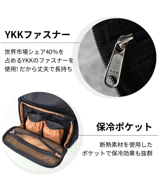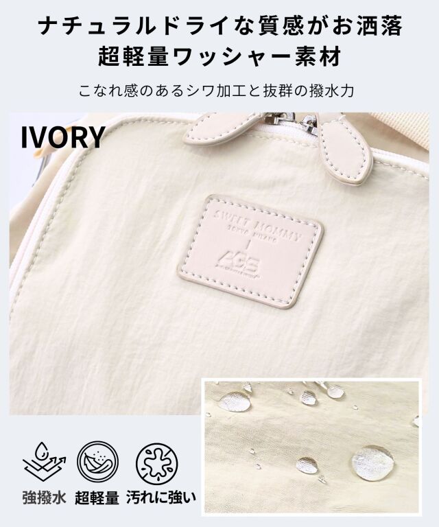 | 素材 | ブラック【強撥水ナイロン】 表地:ナイロン100% 裏地:ポリエステル100% アイボリー【超軽量ワッシャー素材】 表地:ポリエステル100% 裏地:ポリエステル100% |