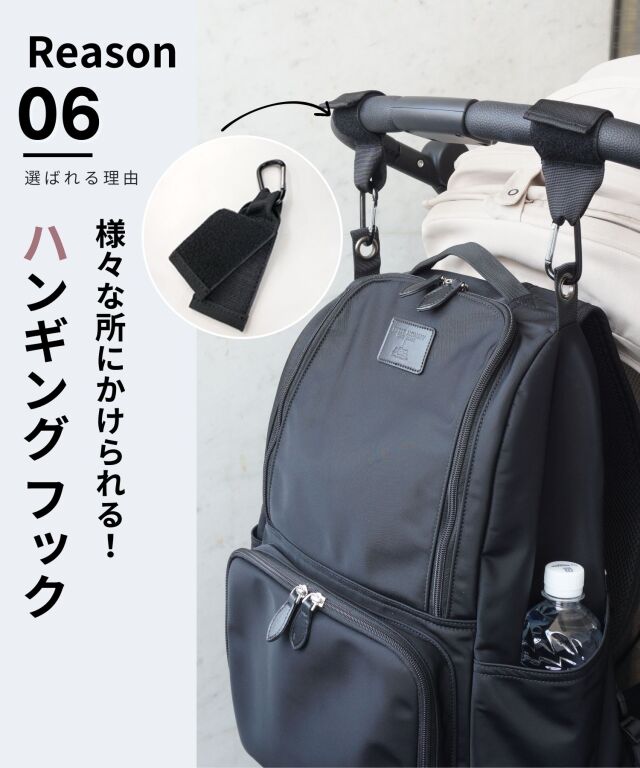 背中ファスナーがついておりリュックを降ろさなくても中身が取り出せて快適。ベビーカーフック付きで、おでかけ中もママの負担が減りストレスフリーです。