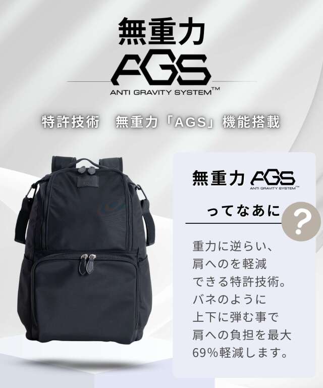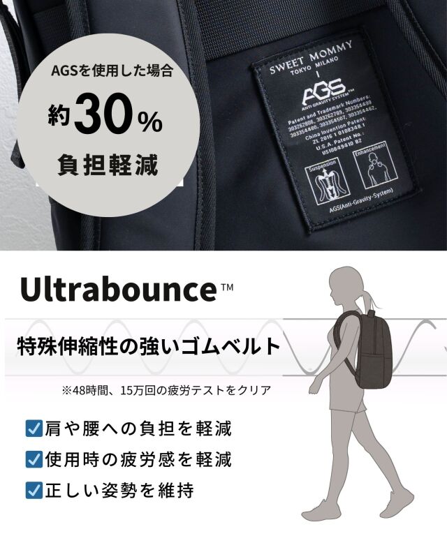 特許技術「AGS」機能搭載!ウルトラバウンスと呼ばれる伸縮性の高い特殊ゴムベルトがバネのように働き、歩くたびに肩の負担を軽減!身体に掛かる負担を30%軽減します。