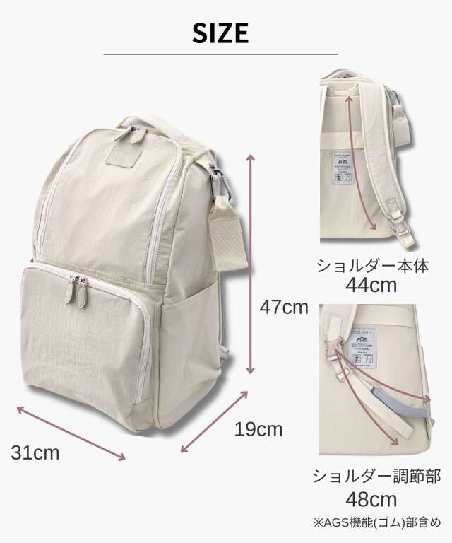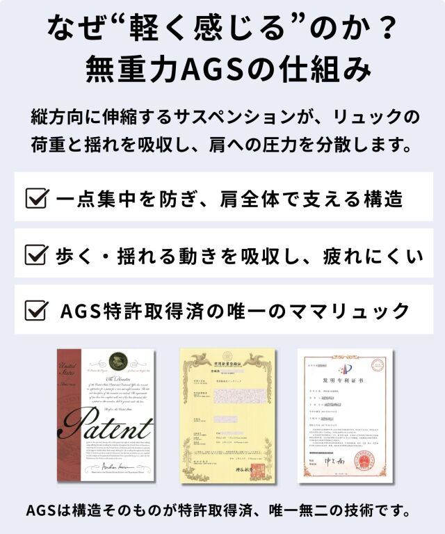 日本初!AGS機能搭載のマザーズリュックです。ママバッグに見えない上質な質感の大容量版マザーズリュックです。特許技術「AGS」機能搭載!ウルトラバウンスと呼ばれる伸縮性の高い特殊ゴムベルトがバネのように働き、歩くたびに肩の負担を軽減!身体に掛かる負担を30%軽減します。背中ファスナーがついており、リュックを降ろさなくても中身が取り出せて快適。ベビーカーフック付きで、おでかけ中もママの負担が減り、ストレスフリーです。大容量&軽量で入院バッグ、陣痛バッグにも使えます。