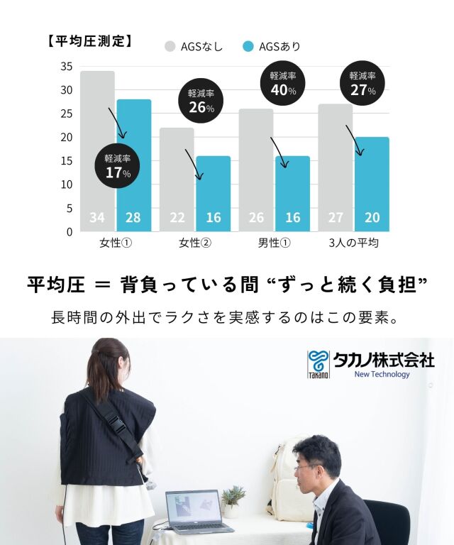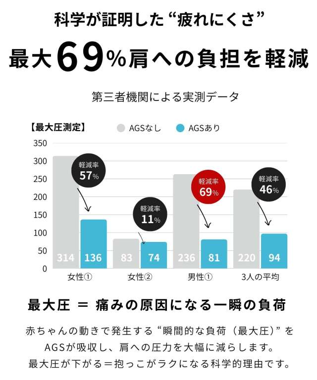 特許技術「AGS」機能搭載!ウルトラバウンスと呼ばれる伸縮性の高い特殊ゴムベルトがバネのように働き、歩くたびに肩の負担を軽減!身体に掛かる負担を最大69%軽減します。