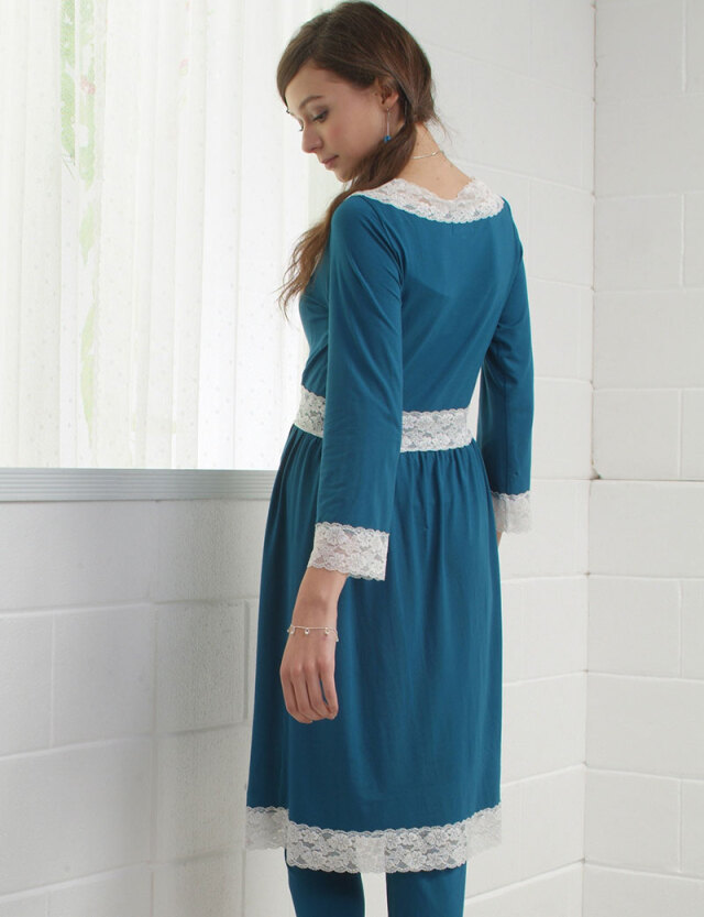 襟まわりや袖口にあしらったレースは、コットン混紡で柔らかく上品です。