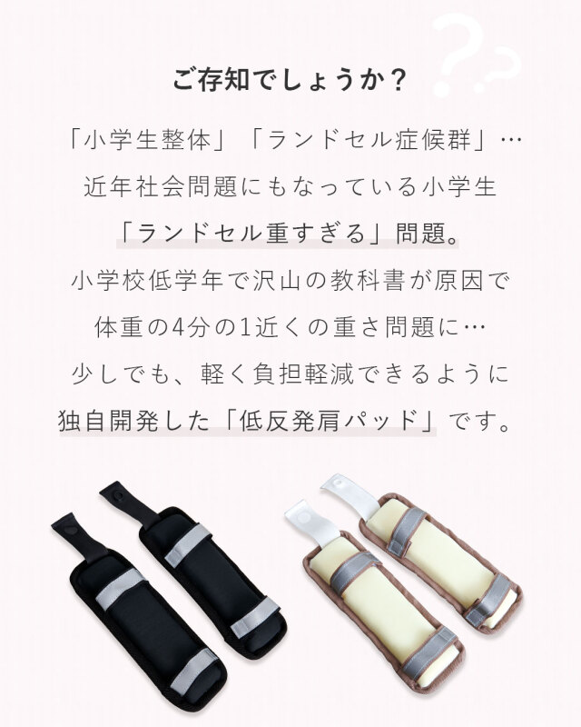 ランドセル重い!問題を考えるスウィートマミーから、付けるだけで肩への負担を軽減、重さを感じにくくする 低反発肩パッド(単品)が登場。どのようなランドセルにも取り付け可能、反射テープ付きで安心、ズレにくい素材を使用し、入学から卒業まで大活躍します。今ならランドセルの付属品としてセット済。お兄ちゃん、お姉ちゃんの進級祝にもお勧めです。