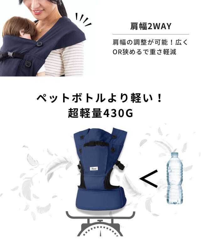 肩調整できたり、安全ベルトや通気性の良い素材が使われていたりと、細かい配慮が良かったです。使い方も分かりやすいです。本体もとても軽く、たたみ方も簡単でコンパクトになります。 気になる点としては、前開き部分のマジックテープの耐久性がどれくらい持つのか?という所と、紐の調整のしにくさです。片手で引っ張るだけで調整できたら夫婦でも共有しやすいなと思います。 |