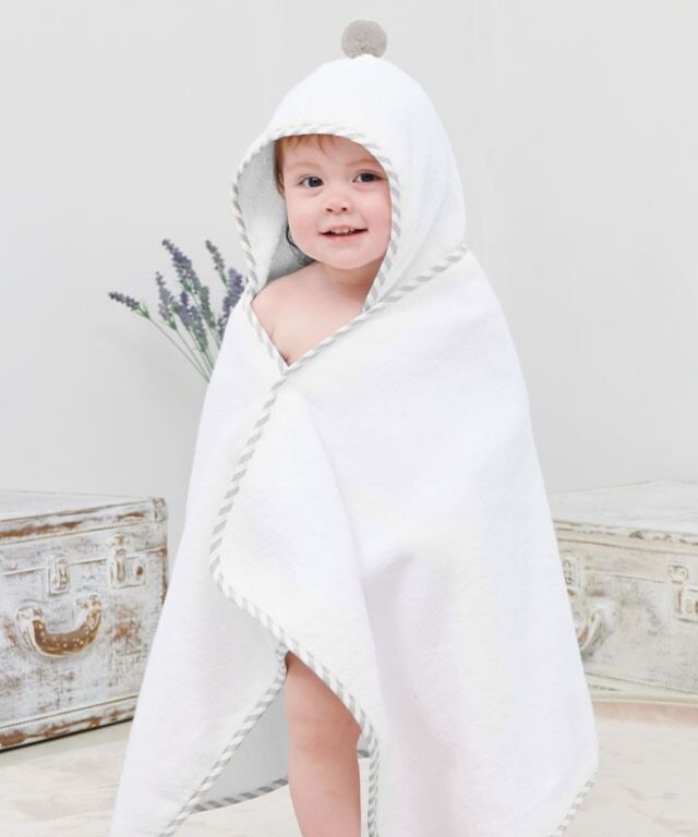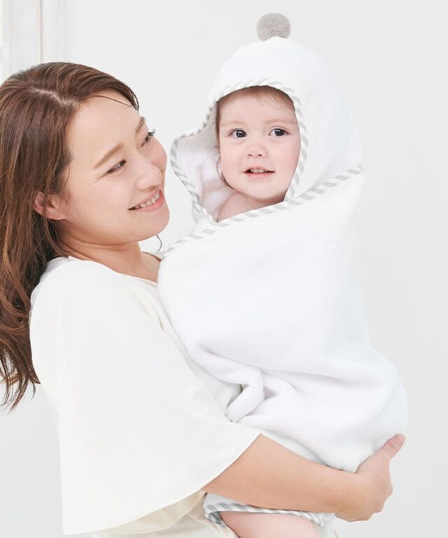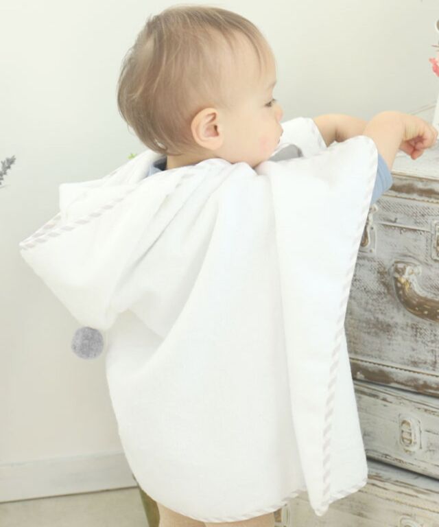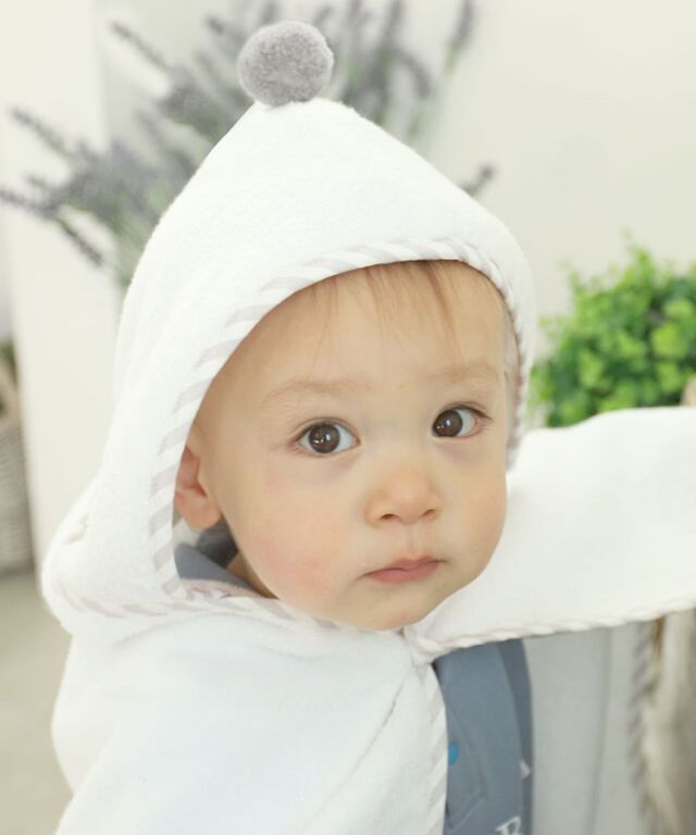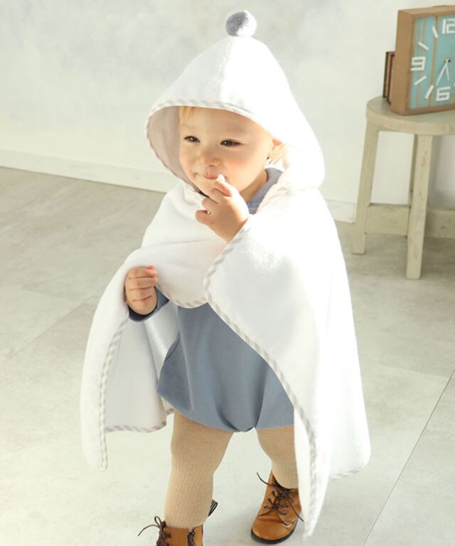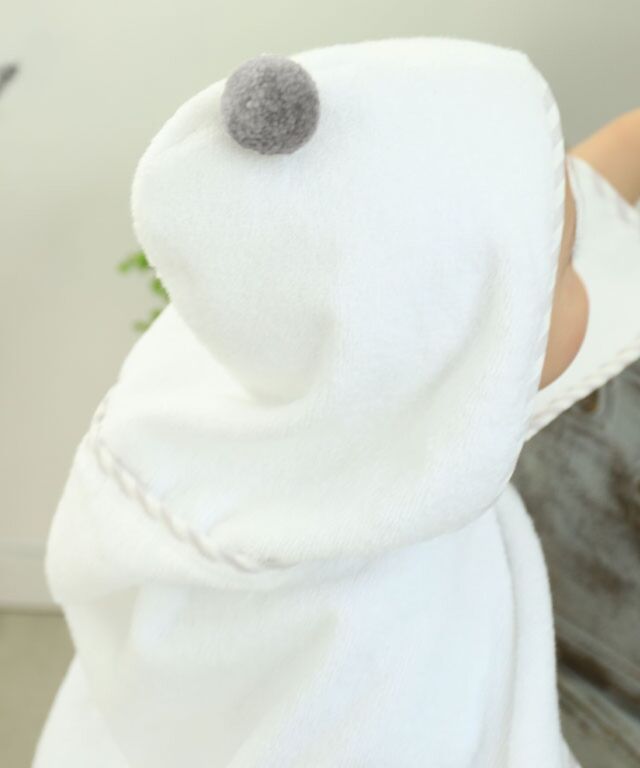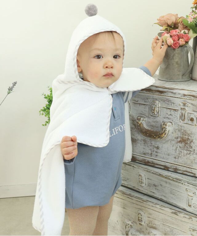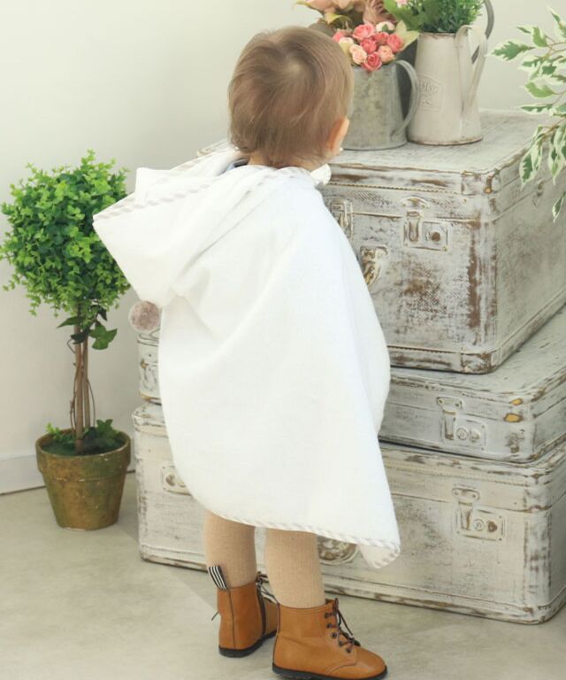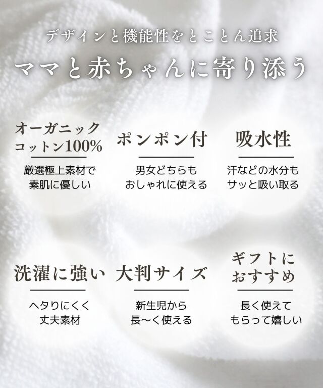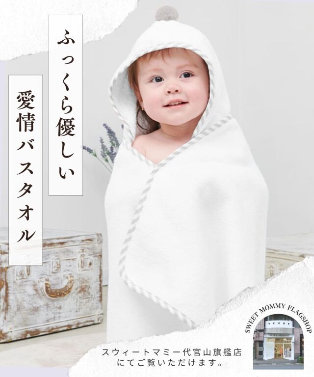 大切なお子様へ最初のプレゼントに。ふわっと優しい肌触りのオーガニックコットン100%バスポンチョです。ぽんぽん付きでとってもキュート。授乳服とマタニティウェアのスウィートマミーおすすめのバスポンチョです。