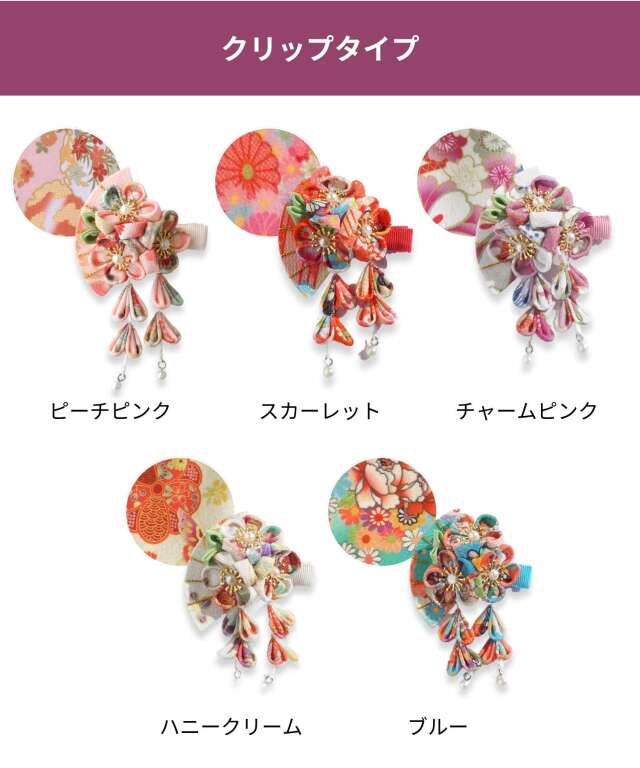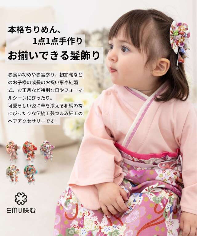 可愛らしい姿に華を添える和柄の袴にぴったりな伝統工芸つまみ細工のヘアアクセサリーです。