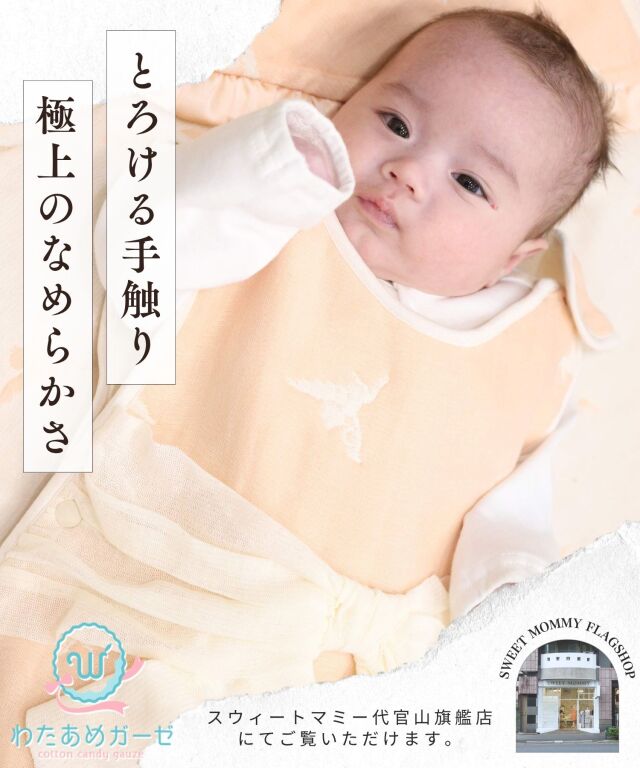 ふんわり軽く、とろけるような優しいわたあめガーゼ。大きなチュールリボンが可愛らしく、ベビーちゃんをラッピングしているよう。優しいグラデーションカラーとエンジェル柄の登場です。マタニティウェアと授乳服の通信販売スウィートマミー。