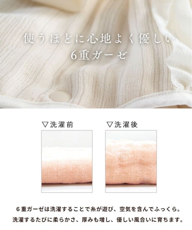 洗うほどに肌ざわりがよくなっていく6重ガーゼはベビーにベストな素材。
