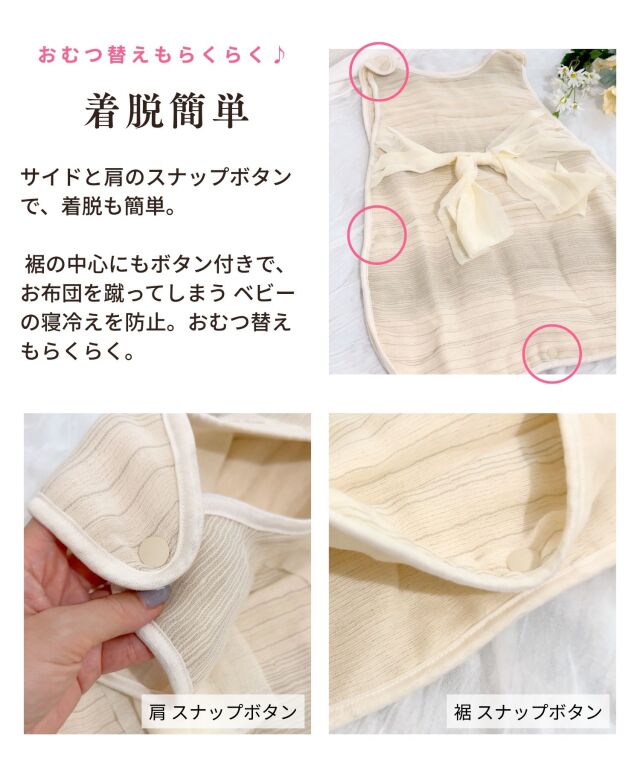 サイドと肩のスナップボタンで、着脱も簡単。 裾の中心にもボタン付きで、お布団を蹴ってしまう ベビーの寝冷えを防止。おむつ替えもらくらく。