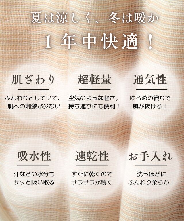 秋冬はあたたまった空気を包み込んで逃がさない。 しっかり保温するので6重ガーゼは驚くほど暖かで1年中活躍。