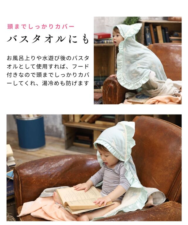 お風呂上りのバスタオルとして使用すれば、フード付きなので頭までしっかりカバーしてくれ、湯冷めも防げます。