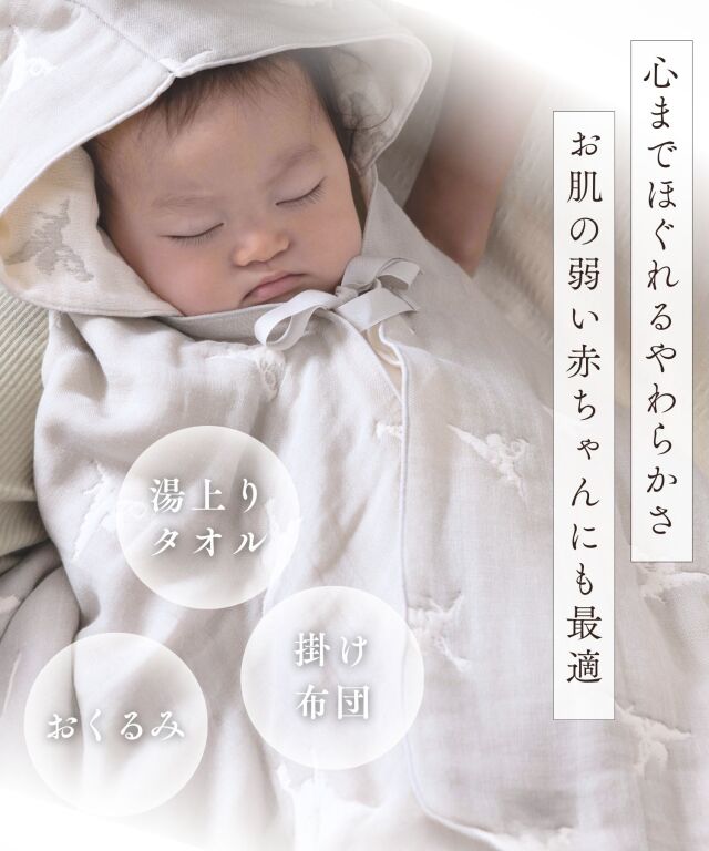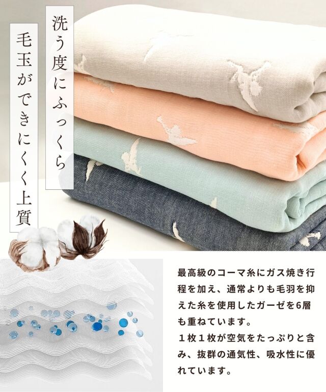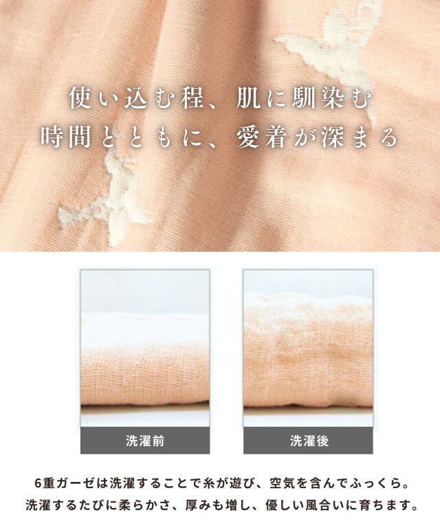 6重構造により、使うほどにふわっとした柔らかさと弾力感が感じられ、肌に優しく触れるので、赤ちゃんや敏感肌の方にも安心してお使いいただけます。