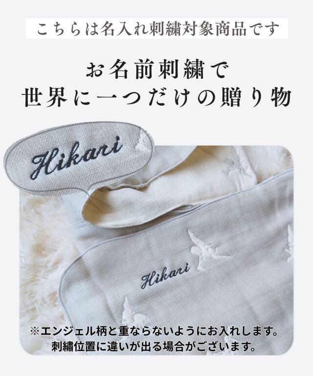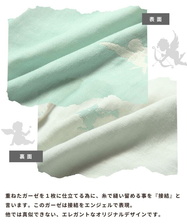 重ねたガーゼを1枚に縫い留める接結で天使を描き、他にはないエレガントなデザインは日本の職人による匠の技。