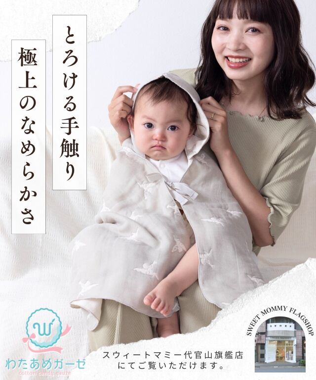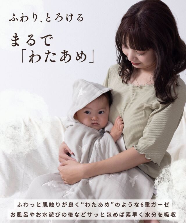 大切なお子様へ最初のプレゼントに。ふわっと優しい肌触りの日本製「わたあめ」6重ガーゼの大判バスポンチョです。シンプルでおしゃれなデザインだから様々なシーンで大活躍します。授乳服とマタニティウェアのスウィートマミーおすすめです。