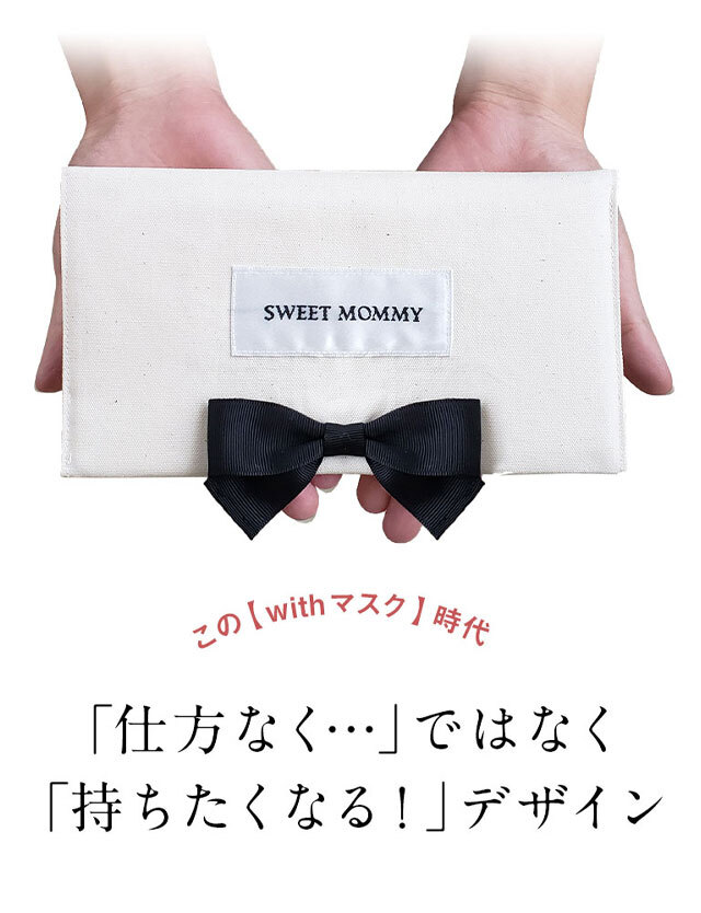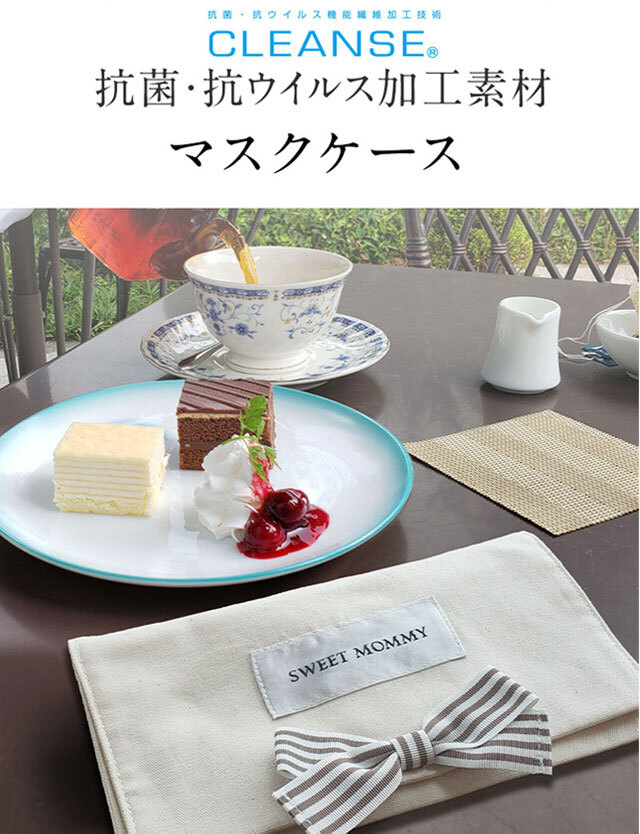 食事や水分補給の際に、一度外したマスク、どこに置いていますか?ウイルスが付いているかもしれないマスクを、うかつに置けないオフィスやレストランで大活躍するマスクケースです。抗菌・抗ウイルス加工素材 を使用して、安心・安全。洗えるコットン100%素材に、かわいいグログランリボンがおしゃれ。ジュエリーケースみたいに可愛いスウィートマミーのオリジナル マスクケースです。