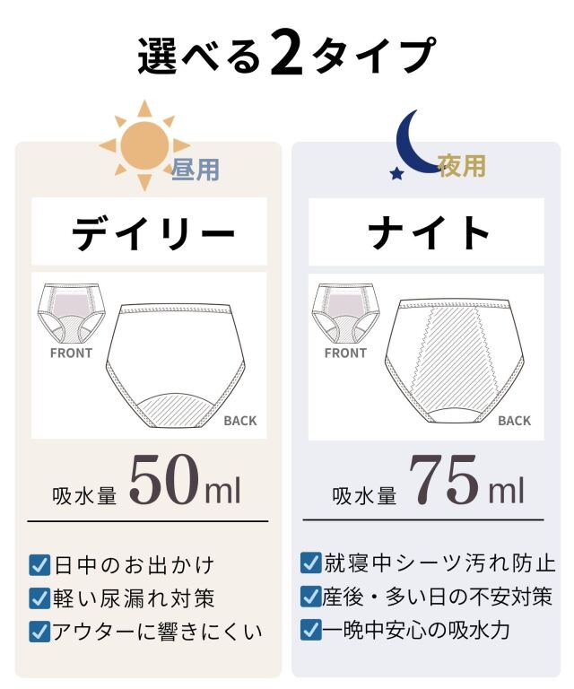 昼用50ml・夜用75mlの2タイプでしっかり吸水。