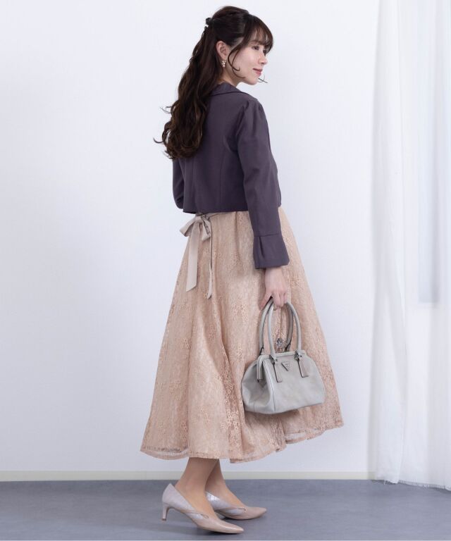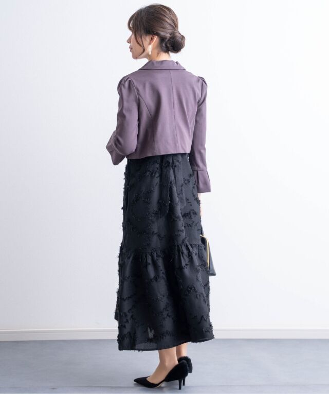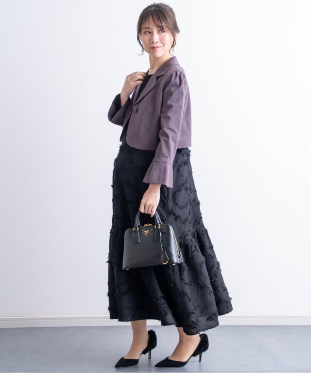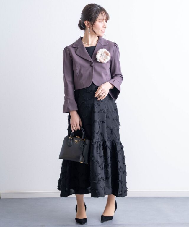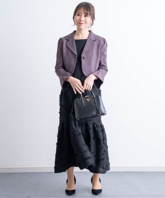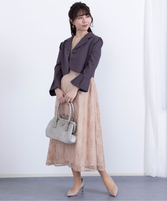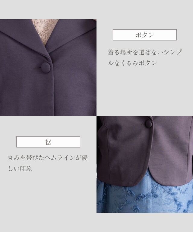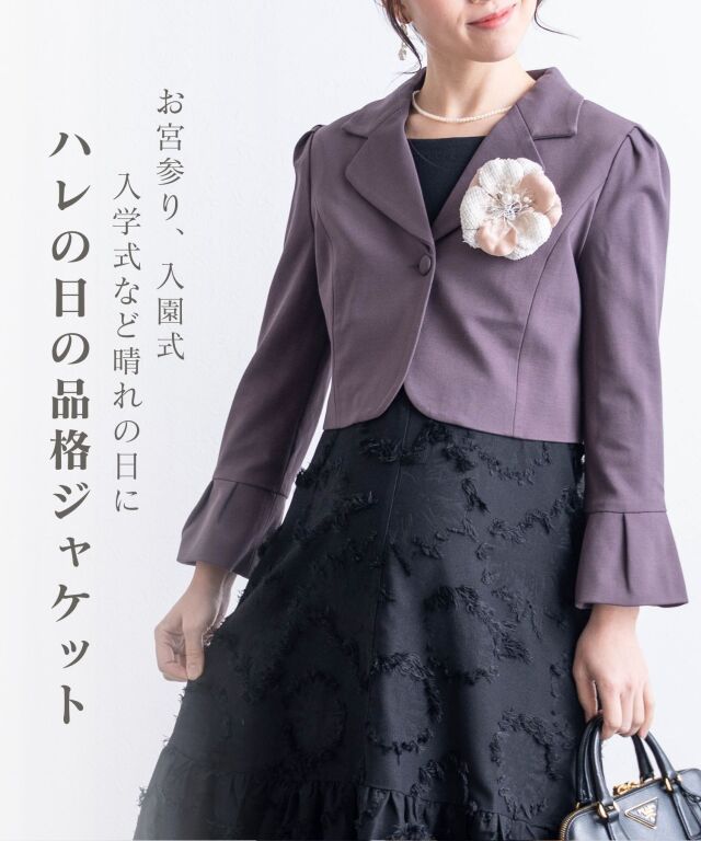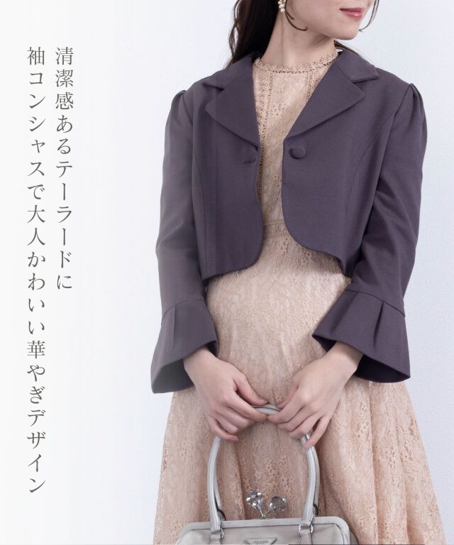 シックなカラーとコンパクトなショート丈が、どんなワンピースにもあわせやすいボレロジャケットです。デコルテラインを上品に見せるVゾーンが清潔感ときちんと感を演出して、どんなシーンにも好印象。程よい長さの袖口にはタックプリーツを入れ、シンプルなデザインの中に華やぎを感じさせる女性らしいポイントになっています。ショート丈は、視線を上に上げると同時に靴を脱いだ時にもシルエットをすらりと美しく見せてくれる効果が。 冠婚葬祭、入卒園やお宮参りなどのセレモニーやオフィスにもオールマイティに着まわせるワンボタン。