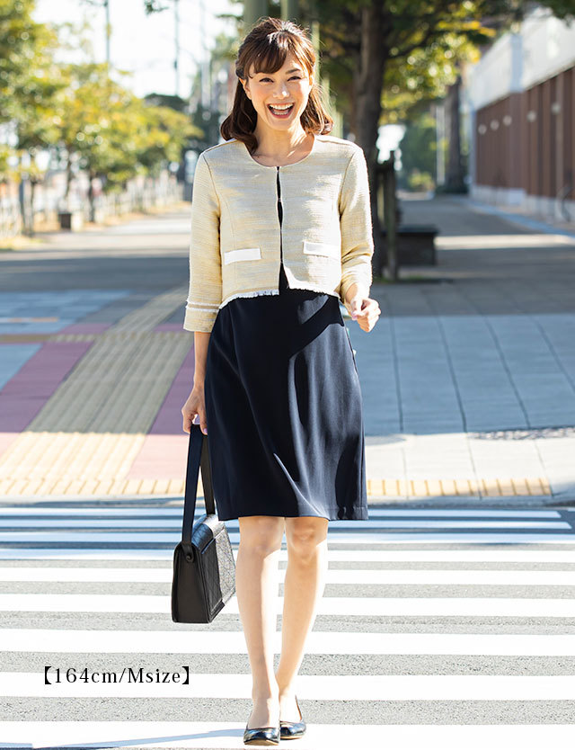 上品に見えて、柔らかなツイード素材のジャケットは、カーディガンのような軽やかな着心地。