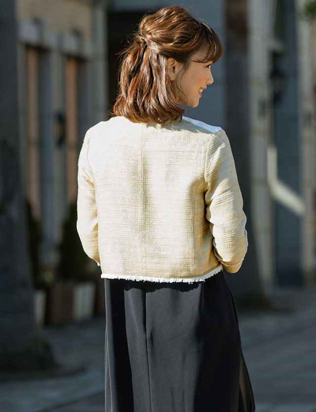 上品な光沢の高級感あるラメ混ツイードは、さらりと羽織るだけでワンランク上のスタイルを演出。柔らかくて軽い着心地で、カジュアルダウンしてもおしゃれ!