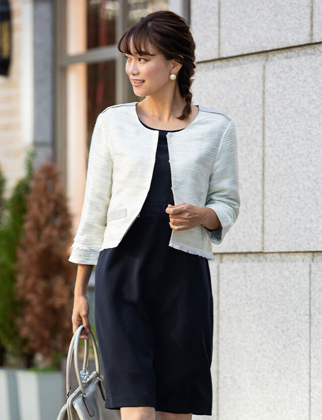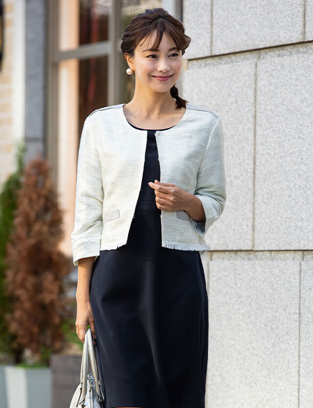 かしこまりすぎない、やさしいノーカラーで、冠婚葬祭、入卒園や、お宮参りなどの セレモニーやオフィスにもぴったり。もちろん、カジュアルダウンにデニムなどと合わせて普段使いもOK!ワンピース1枚では心もとないお出かけの時も、体温調節や華やかさを添えるのに欠かせない1枚です。