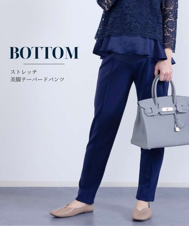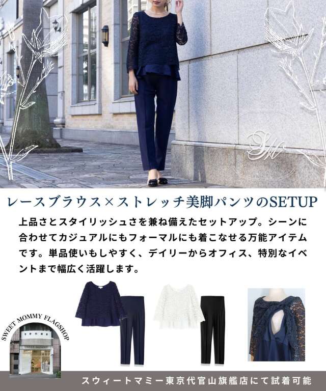 レーシーレイヤード×テーパード セットアップはパンツ派のママに嬉しい!スウィートマミーのフォーマルパンツセットアップです。上質なレースのトップスにスタイリッシュなテーパードパンツスタイルがおしゃれ。マタニティウェア通販専門店スウィートマミーおすすめのセットアイテムです。