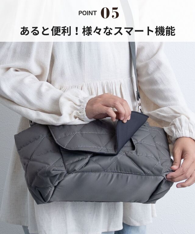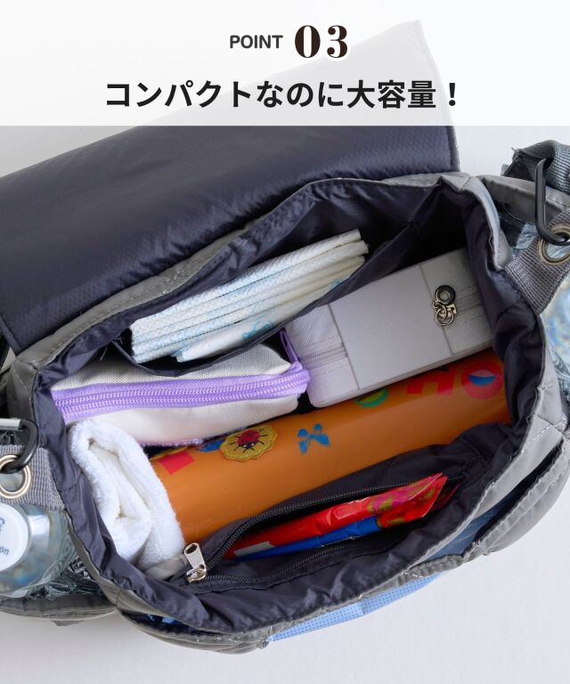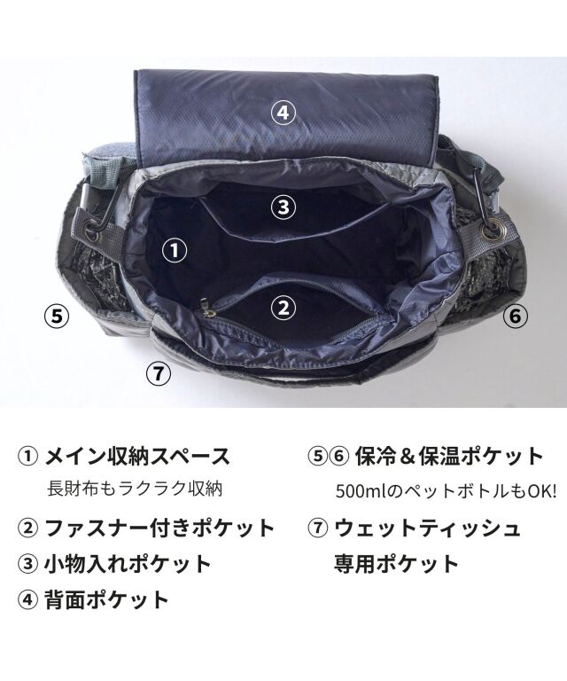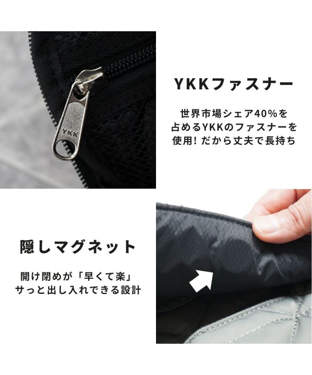 ファスナー付きポケット、大容量の収納スペースで、お財布・スマホ・おやつなどをしっかり収納。