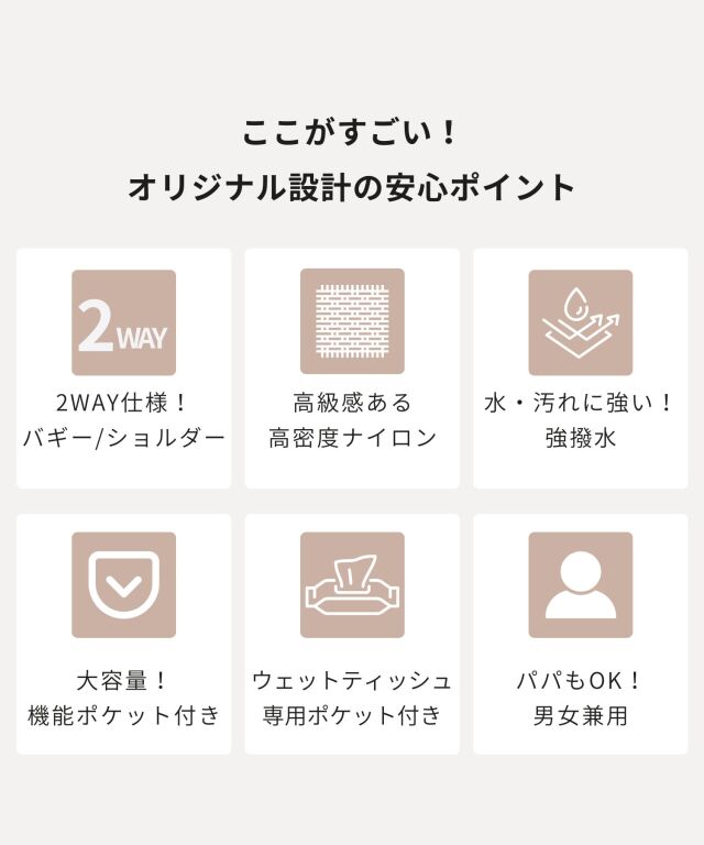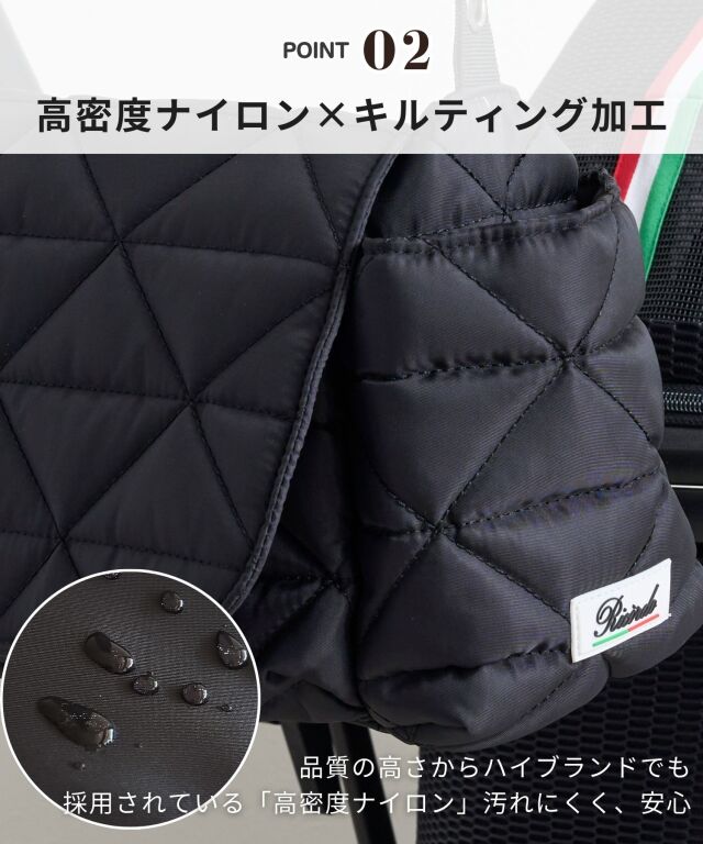 強撥水ナイロン素材で水や汚れに強く、外出時も安心。
