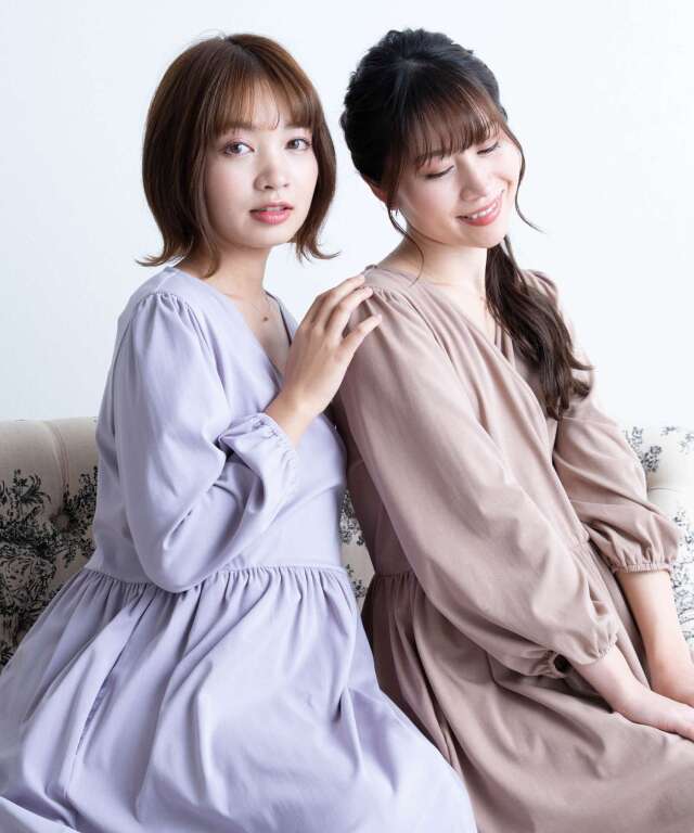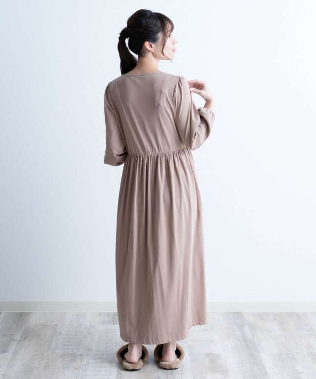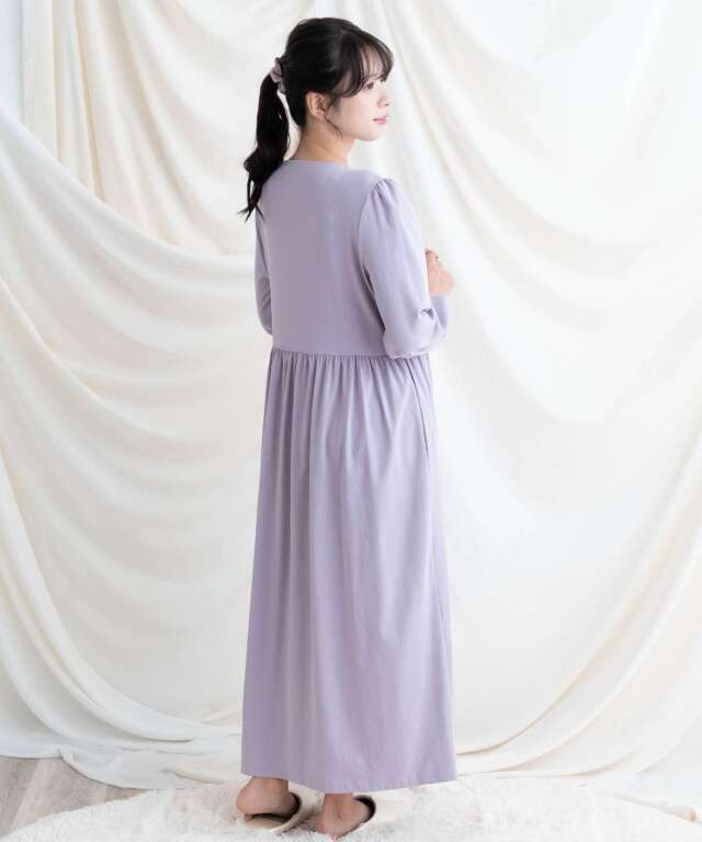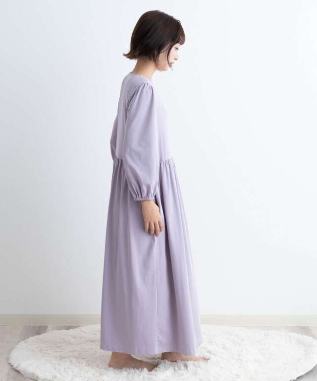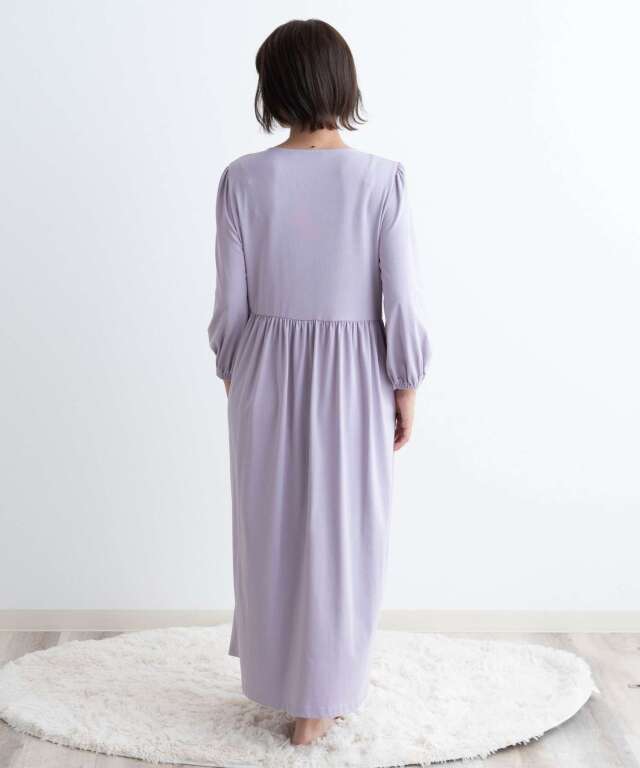 ウエストで切り替えたシルエットがふんわり広がり、産院でもおうち時間でも自信を持って着られるワンピースタイプです。