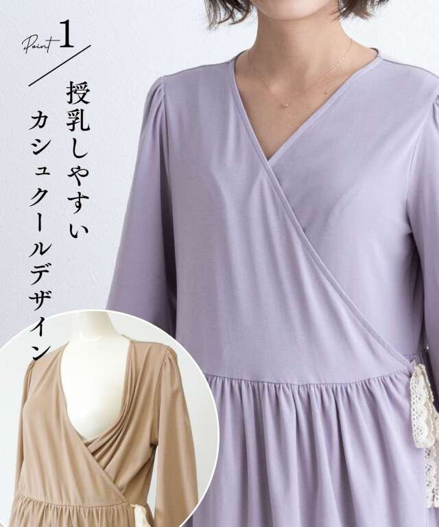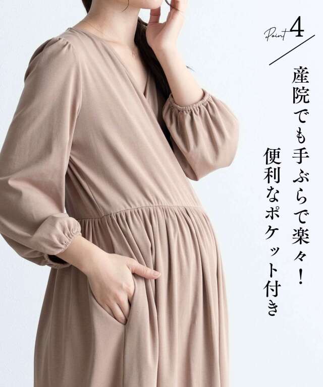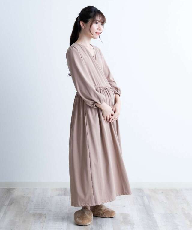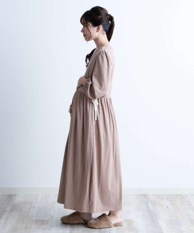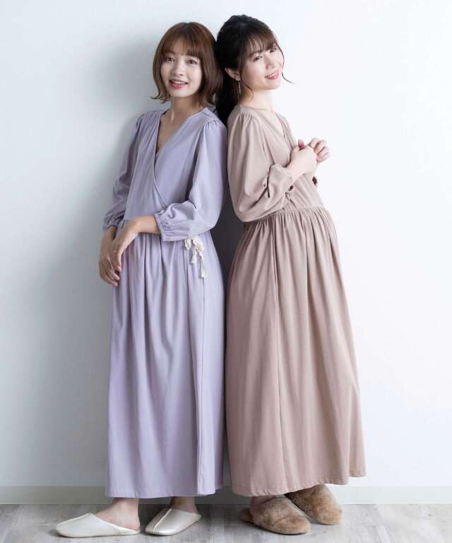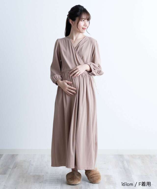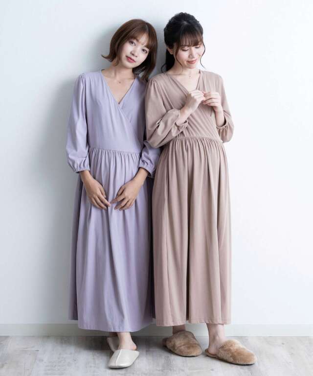 胸元は授乳しやすいカシュクール仕様で、入院中のマタニティフォトやベビーとの記念撮影にも映える一着。