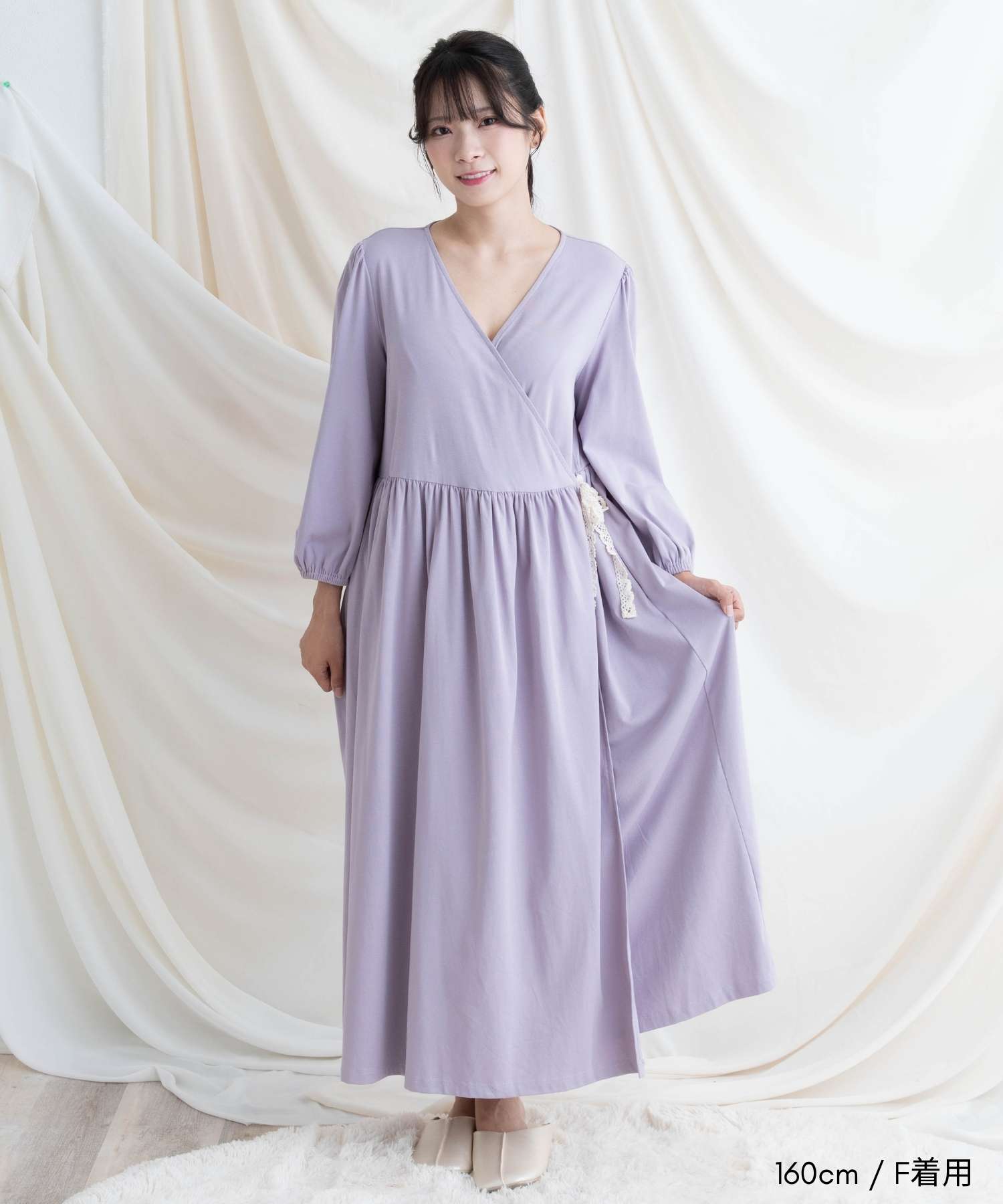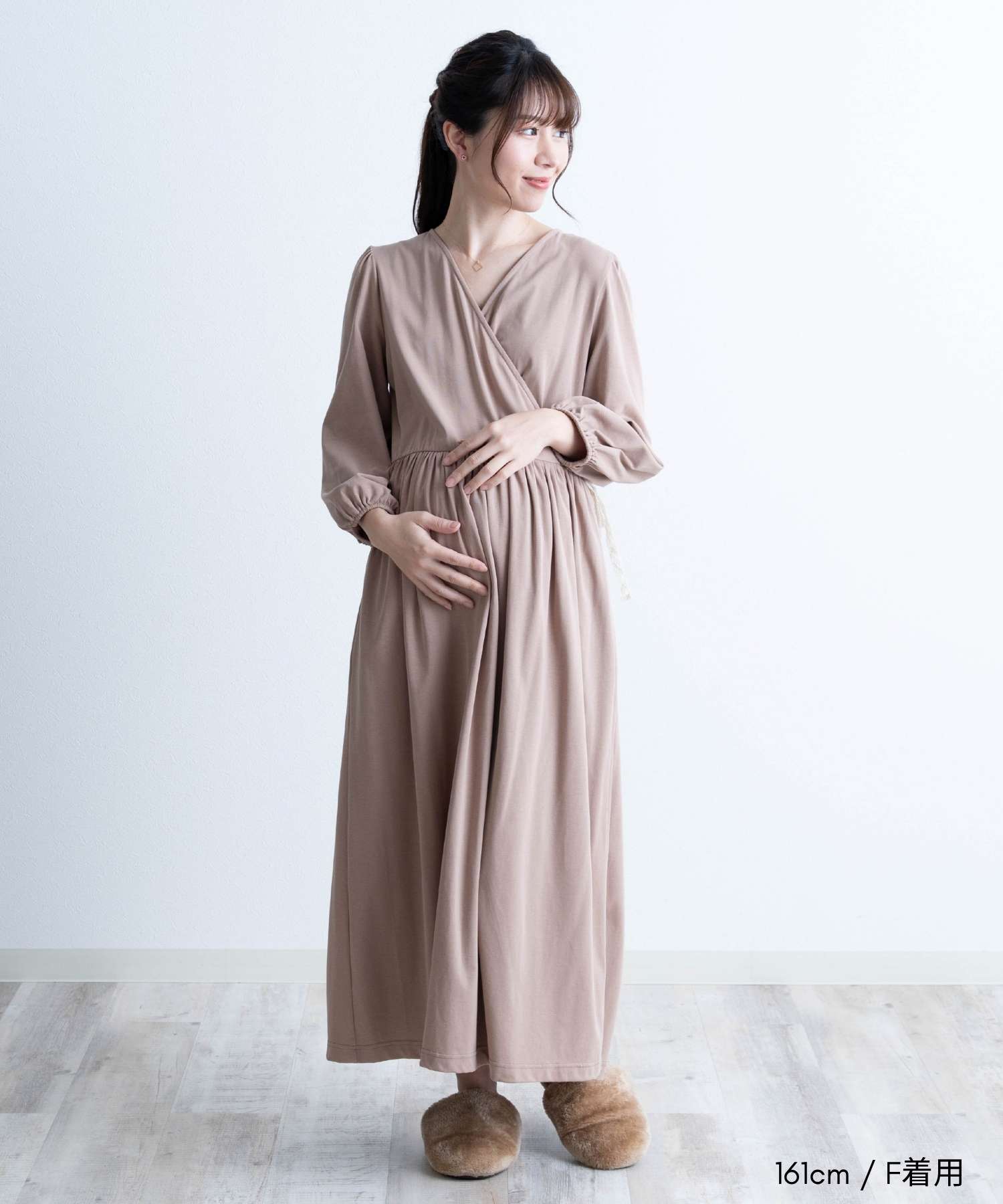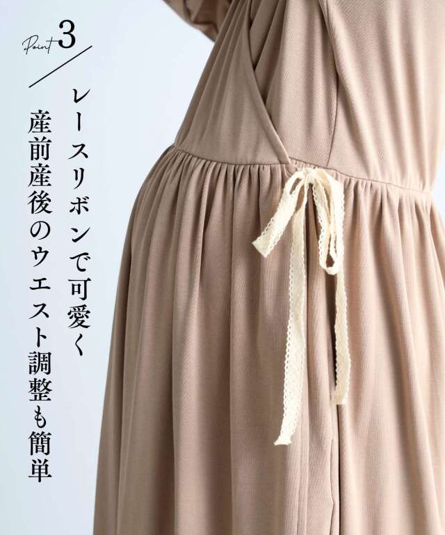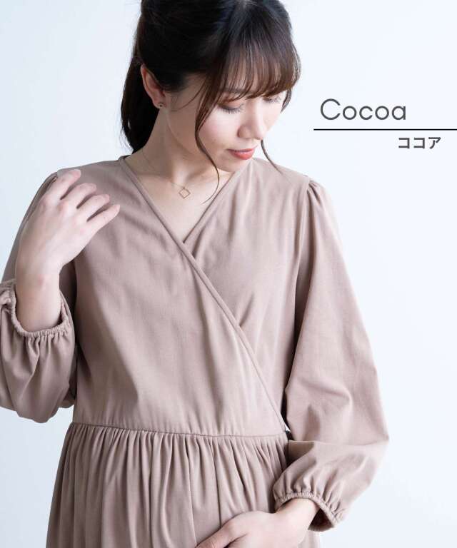 胸元は授乳しやすいカシュクール仕様で、入院中のマタニティフォトやベビーとの記念撮影にも映える一着。