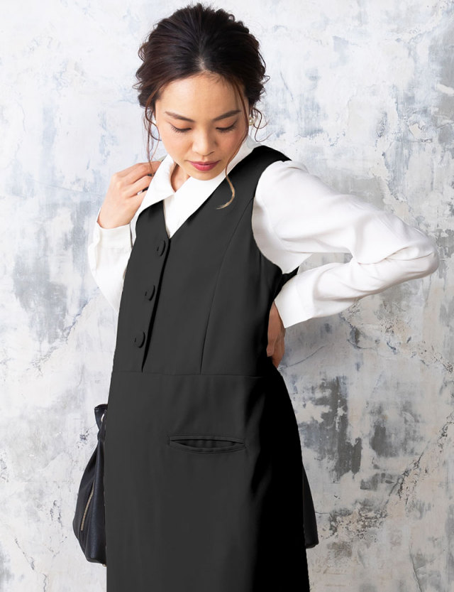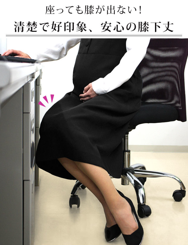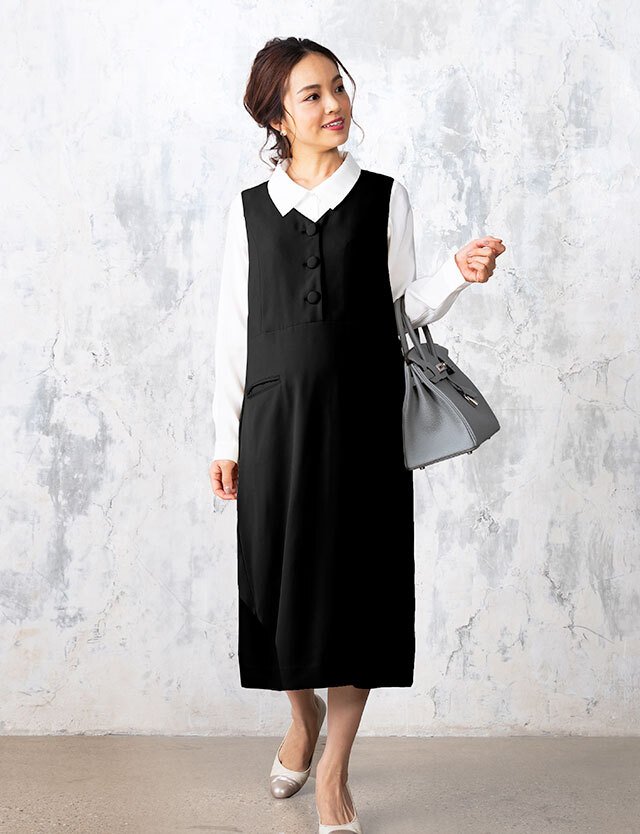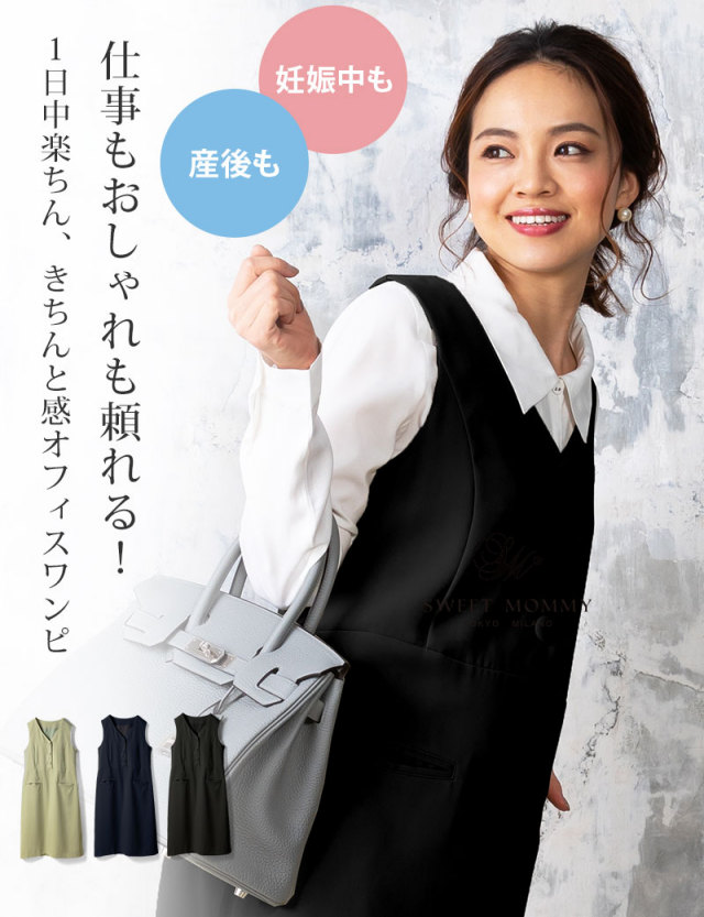 リュクス漂う上質素材で、しわになりにくくきちんと感のあるオフィスワンピースです。膝までしっかりと隠れる丈感で、ブラウスやタートルなどインナーを変えれば1年中着られ、産休明けもしっかり着回せる優秀デザインです。マタニティウェアと授乳服の通信販売スウィートマミーおすすめの事務服です。