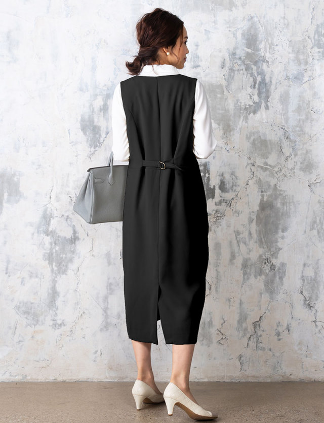 リュクス漂う上質素材で、しわになりにくくきちんと感のあるオフィスワンピースです。膝までしっかりと隠れる丈感で、ブラウスやタートルなどインナーを変えれば1年中快適、産休明けもしっかり着回せる優秀デザインです。ゆったりシルエットのIラインは、縦長効果もあり簡単に着痩せして、着心地楽ちん♪程よく開いたVネックは、清潔感もあり、お客様対応にも好印象。顔回りをすっきりと魅せます。