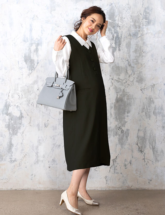 きれいめなワンピはオフィスだけでなく、学校行事や冠婚葬祭にも◎。産後まで長く着まわせるスウィートマミーこだわりの逸品です。