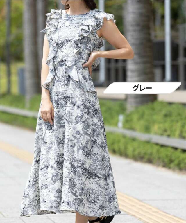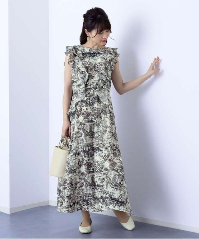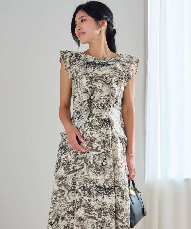 動く度に揺れるたっぷりのフリルが印象的な、大人フェミニンなトワルドジュイ柄風ワンピース。