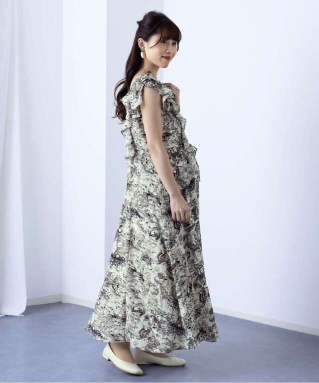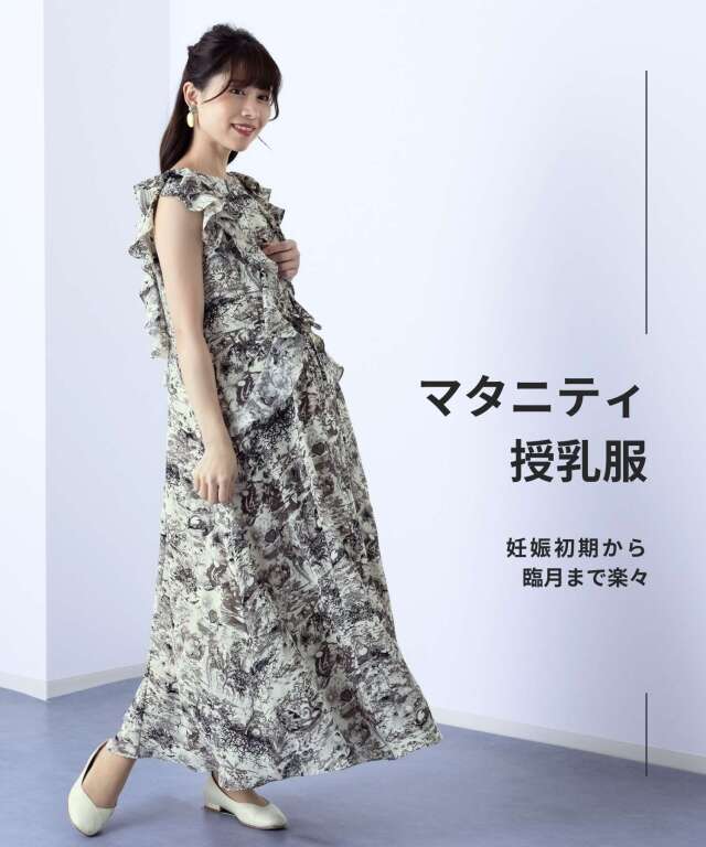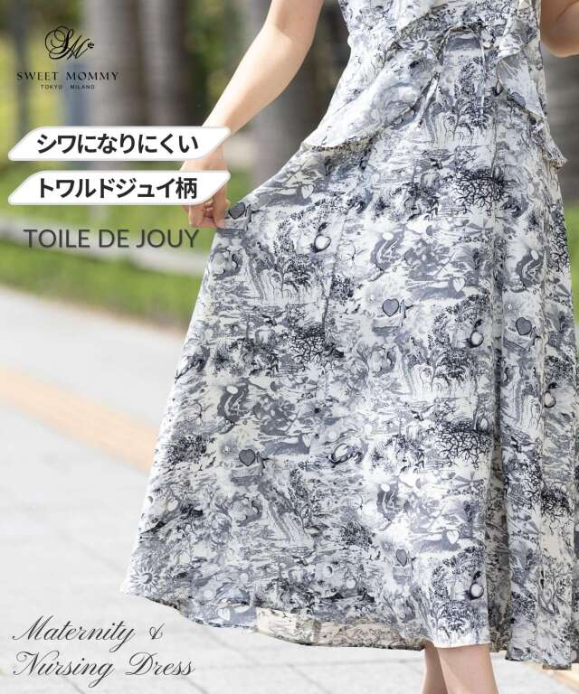 動く度に揺れるたっぷりのフリルが印象的な、大人フェミニンなトワルドジュイ柄風ワンピース。肩から腰にかけてたっぷりとあしらったフリルで華やぎをプラス。ニュアンスカラーで落ち着きある、きちんと感も演出してくれます。スウィートマミーおすすめの授乳服マタニティウェアです。