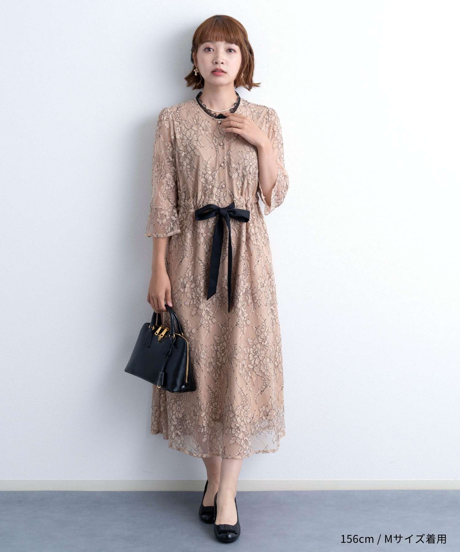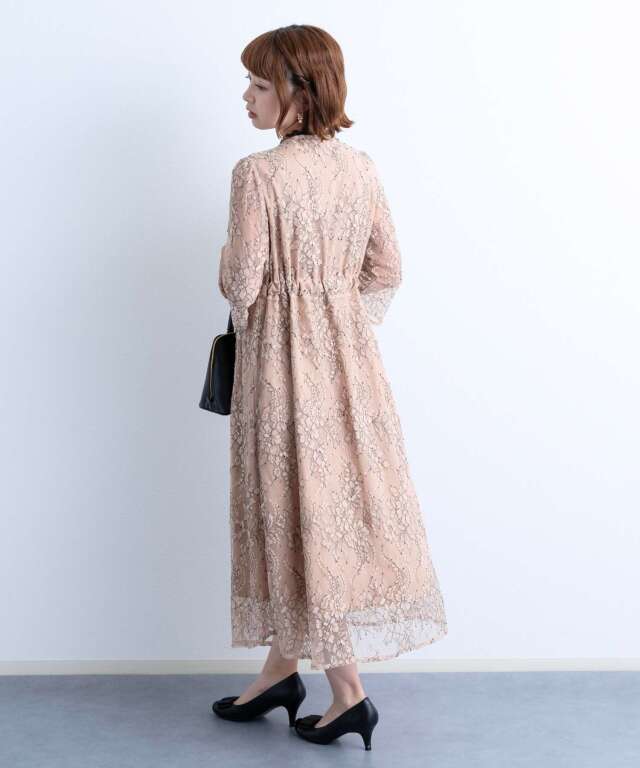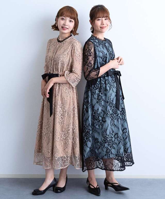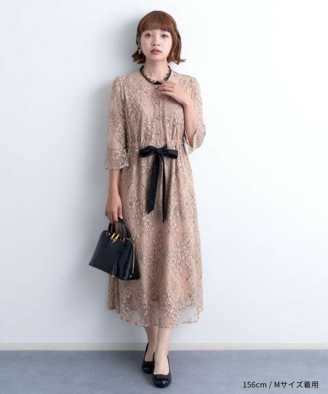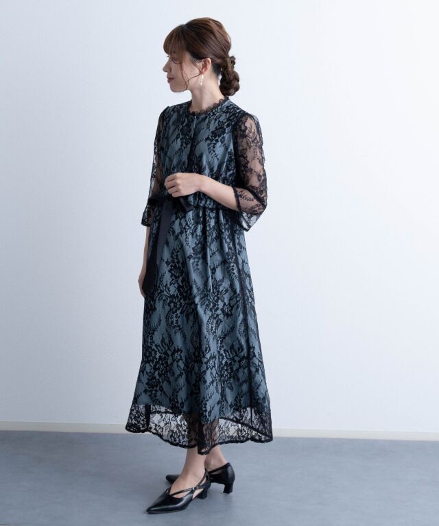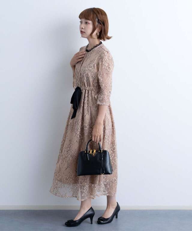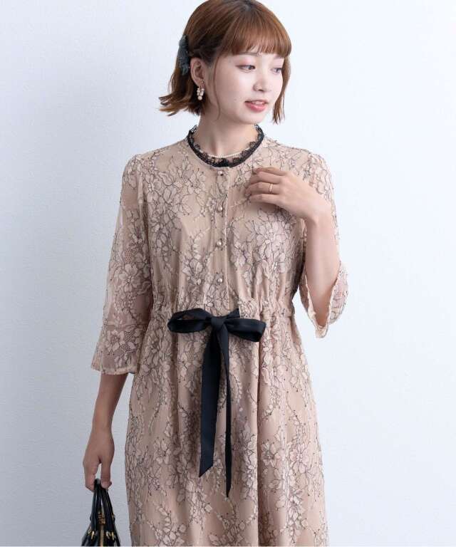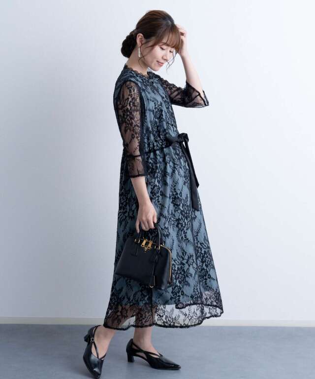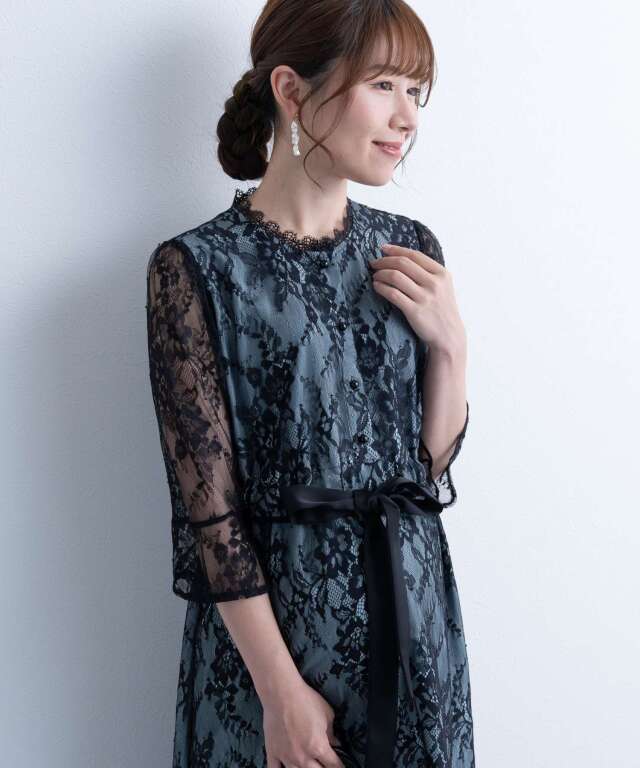 繊細で高級感漂う上品レースと、首回りのレースやサテンのウエストリボンなど様々な素材を組み合わせたフレンチシックなワンピース。