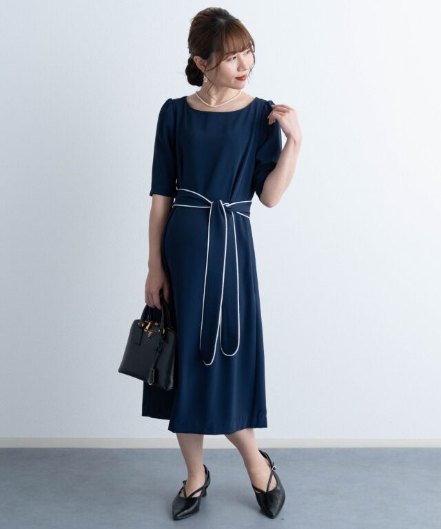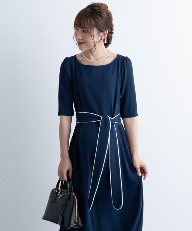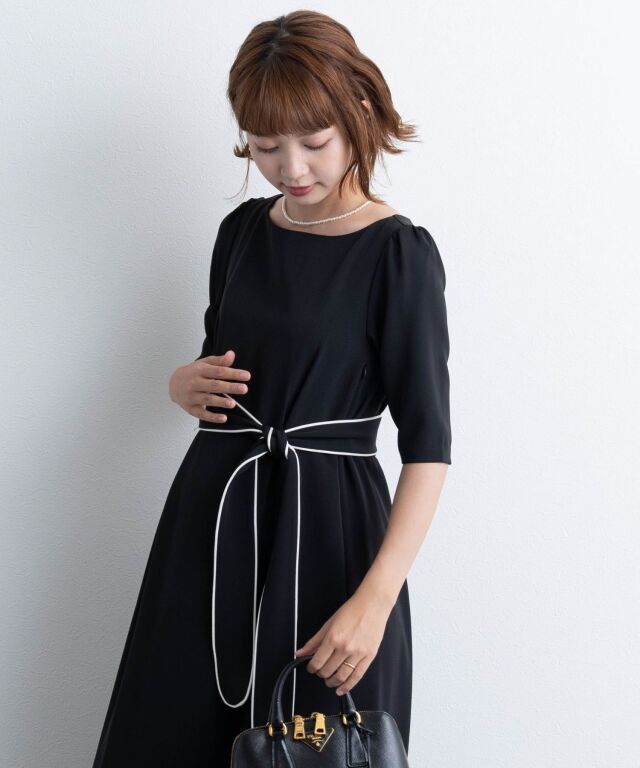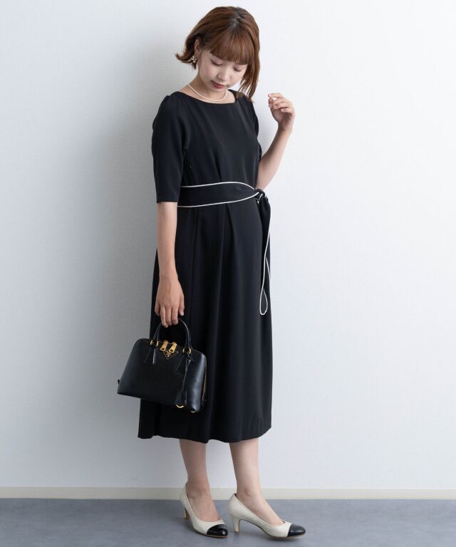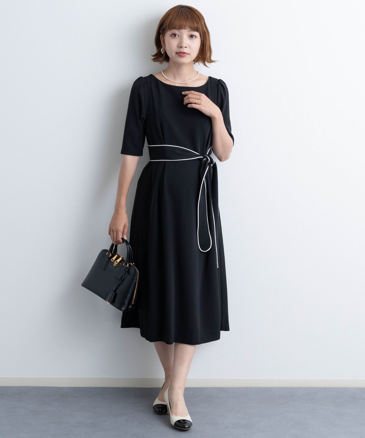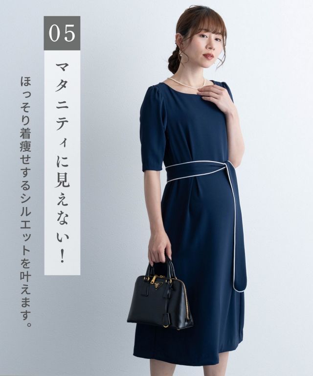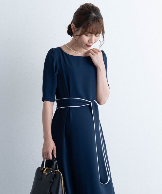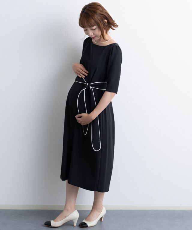 バイカラーのパイピングを効かせたリボンがポイントのシンプルでスタイリッシュなオケージョン授乳服ワンピ。冠婚葬祭やキレイ目普段着としてもおすすめのマタニティウェアです。骨格診断で骨格ストレートと診断された方には特にスタイルアップでご着用いただけます。