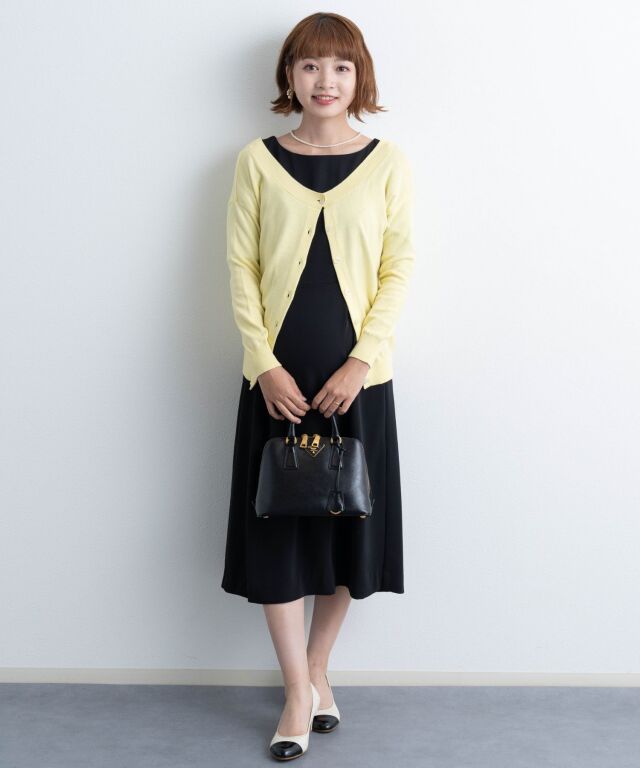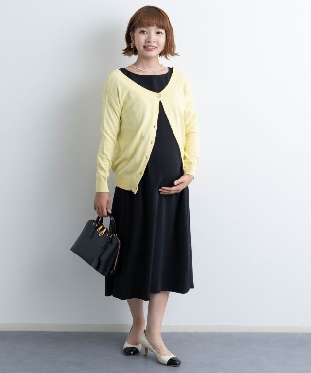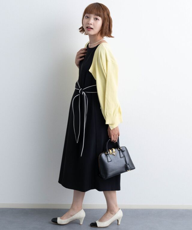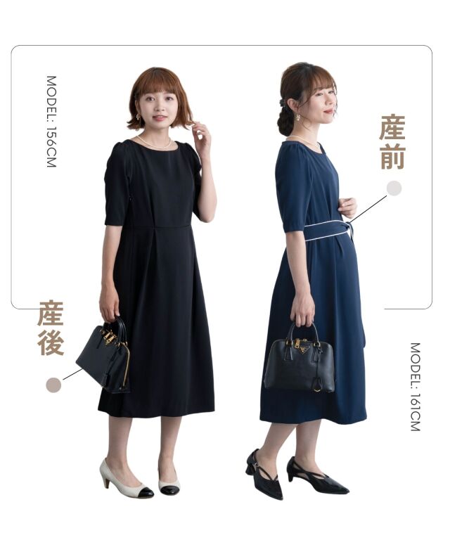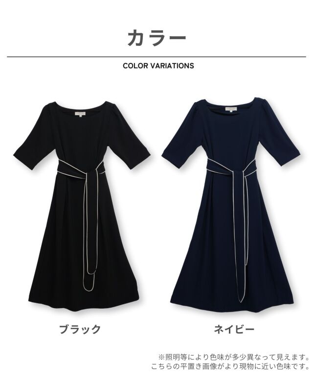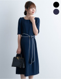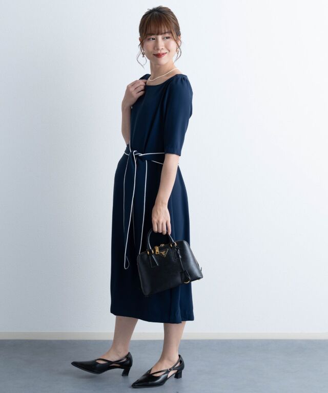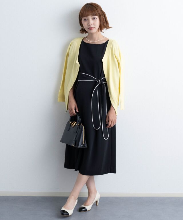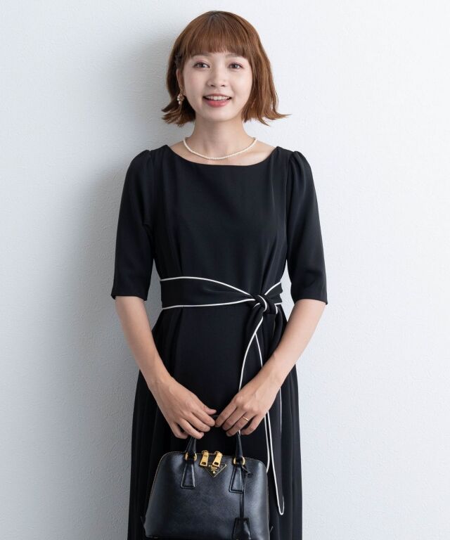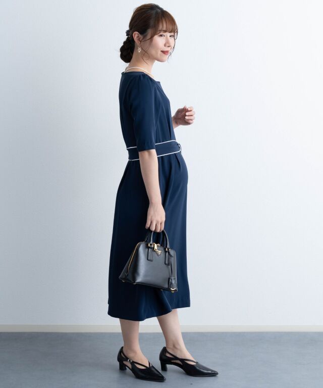 バイカラーのパイピングを効かせたリボンがポイントのシンプルでスタイリッシュなオケージョン授乳服ワンピ。冠婚葬祭やキレイ目普段着としてもおすすめのマタニティウェアです。骨格診断で骨格ストレートと診断された方には特にスタイルアップでご着用いただけます。