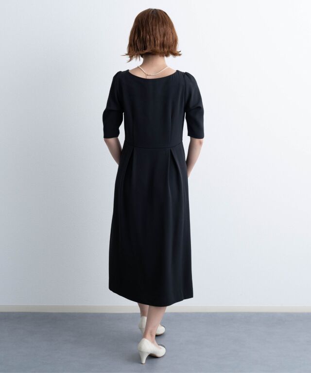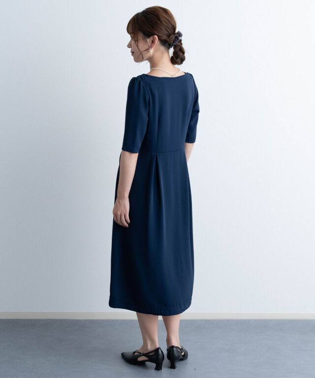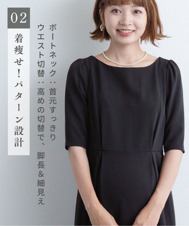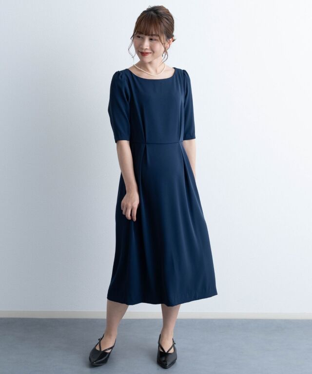 ボートネックと高めのウエスト切替が、妊娠中でもすっきりと見せる着痩せシルエットを演出します。